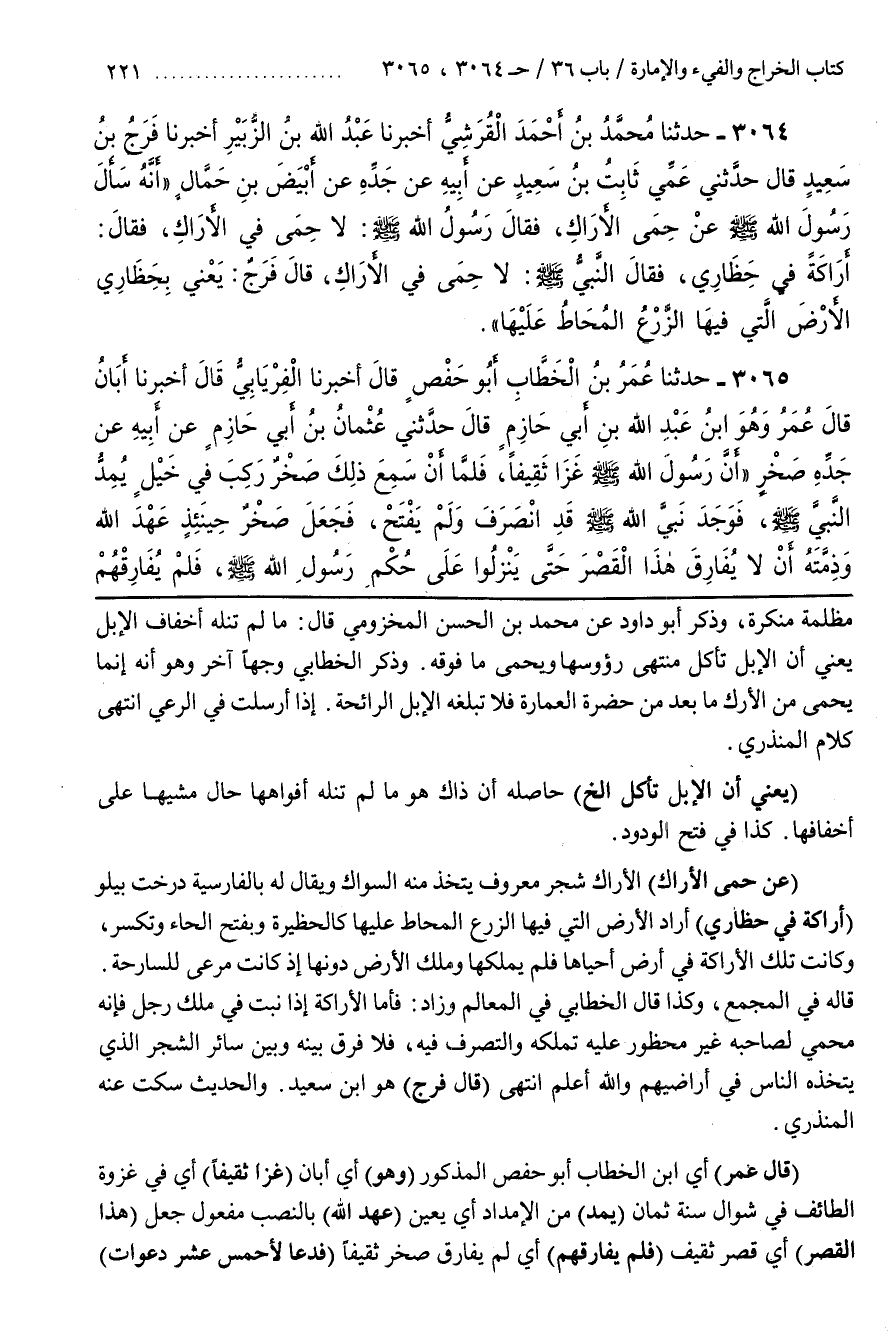 [3066] (عَنْ حِمَى الْأَرَاكِ) الْأَرَاكُ شَجَرٌ مَعْرُوفٌ يُتَّخَذُ مِنْهُ السِّوَاكُ وَيُقَالُ لَهُ بِالْفَارِسِيَّةِ درخت بيلو (أَرَاكَةً فِي حِظَارِي) أَرَادَ الْأَرْضَ الَّتِي فِيهَا الزَّرْعُ الْمُحَاطُ عَلَيْهَا كَالْحَظِيرَةِ وَيُفْتَحُ الْحَاءُ وَتُكْسَرُ وَكَانَتْ تِلْكَ الْأَرَاكَةُ فِي أَرْضٍ أَحْيَاهَا فَلَمْ يَمْلِكْهَا وَمَلَكَ الْأَرْضَ دُونَهَا إِذْ كَانَتْ مَرْعًى لِلسَّارِحَةِ
