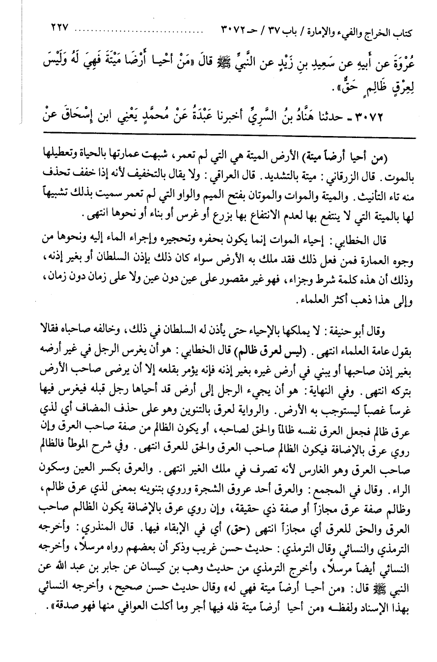 قَالَ الْمُنْذِرِيُّ وَأَخْرَجَهُ التِّرْمِذِيُّ وَالنَّسَائِيُّ وَقَالَ التِّرْمِذِيُّ حَدِيثٌ حَسَنٌ غَرِيبٌ وَذَكَرَ أَنَّ بَعْضَهُمْ رَوَاهُ مُرْسَلًا وَأَخْرَجَهُ النَّسَائِيُّ أَيْضًا مُرْسَلًا وَأَخْرَجَ التِّرْمِذِيُّ مِنْ حَدِيثِ وَهْبِ بْنِ كَيْسَانَ عَنْ جَابِرِ بْنِ عَبْدِ اللَّهِ عَنِ النَّبِيِّ صَلَّى اللَّهُ عَلَيْهِ وَسَلَّمَ قَالَ من أحيى أَرْضًا مَيْتَةً فَهِيَ لَهُ وَقَالَ حَدِيثٌ حَسَنٌ صَحِيحٌ وَأَخْرَجَهُ النَّسَائِيُّ بِهَذَا الْإِسْنَادِ وَلَفْظُهُ مَنْ أحيى أَرْضًا مَيْتَةً فَلَهُ فِيهَا أَجْرٌ وَمَا أَكَلَتِ الْعَوَافِي مِنْهَا فَهُوَ صَدَقَةٌ