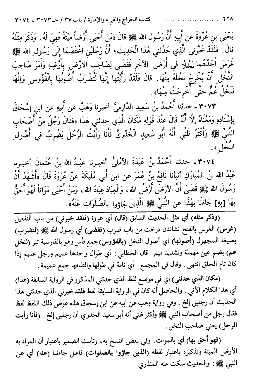 [3074] (وَذَكَرَ مِثْلَهُ) أَيْ مِثْلَ الْحَدِيثِ السَّابِقِ (قَالَ) أَيْ عُرْوَةُ (فَلَقَدْ خَبَّرَنِي) مِنْ بَابِ التَّفْعِيلِ (غَرَسَ) الْغَرْسُ بِالْفَتْحِ نشاندن درخت مِنْ بَابِ ضَرَبَ (فَقَضَى) أَيْ رَسُولُ اللَّهِ صَلَّى اللَّهُ عَلَيْهِ وَسَلَّمَ (لَتُضْرَبُ) بِصِيغَةِ الْمَجْهُولِ (أُصُولُهَا) أَيْ أصول النخل (بالفؤوس) جَمْعُ فَأْسٍ وَهُوَ بِالْفَارِسِيَّةِ تبر (لَنَخْلٌ عُمٌّ) بِضَمِّ عَيْنٍ مُهْمَلَةٍ وَتَشْدِيدِ مِيمٍ