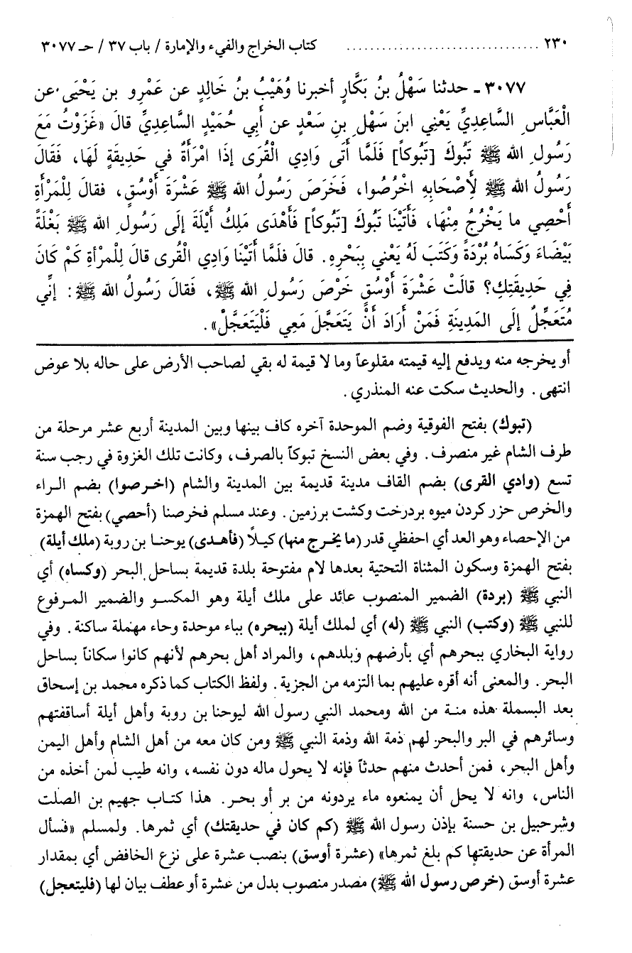 وَفِي بَعْضِ النُّسَخِ تَبُوكًا بِالصَّرْفِ وَكَانَتْ تِلْكَ الْغَزْوَةُ فِي رَجَبٍ سَنَةَ تِسْعٍ (وَادِي الْقُرَى) بِضَمِّ الْقَافِ مَدِينَةً قَدِيمَةً بَيْنَ الْمَدِينَةِ وَالشَّامِ (اخْرُصُوا) بِضَمِّ الرَّاءِ وَالْخَرْصِ حزر كردن ميوه بردرخت وكشت برزمين
