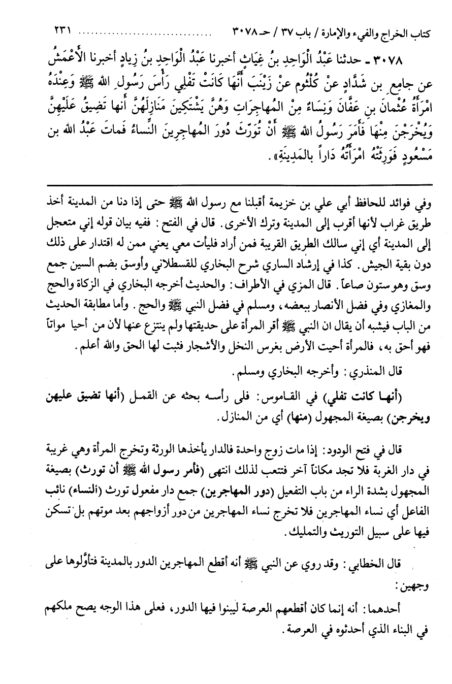 قَالَ فِي فَتْحِ الْوَدُودِ إِذَا مَاتَ زَوْجُ وَاحِدَةٍ فَالدَّارُ يَأْخُذُهَا الْوَرَثَةُ وَتَخْرُجُ الْمَرْأَةُ وَهِيَ غَرِيبَةٌ فِي دَارِ الْغُرْبَةِ فَلَا تَجِدُ مَكَانًا آخَرَ فَتَتْعَبَ لِذَلِكَ انْتَهَى (فَأَمَرَ رَسُولُ اللَّهِ صَلَّى اللَّهُ عَلَيْهِ وَسَلَّمَ أَنْ تُوَرَّثَ) بِصِيغَةِ الْمَجْهُولِ بِشِدَّةِ الرَّاءِ مِنْ بَابِ التَّفْعِيلِ (دُورُ الْمُهَاجِرِينَ) جَمْعُ دَارٍ مَفْعُولُ تُوَرَّثُ (النِّسَاءَ) نَائِبُ الْفَاعِلِ أَيْ نِسَاءَ الْمُهَاجِرِينَ فَلَا تَخْرُجُ نِسَاءُ الْمُهَاجِرِينَ مِنْ دَارِ أَزْوَاجِهِمْ بَعْدَ مَوْتِهِمْ بَلْ تَسْكُنُ فِيهَا عَلَى سَبِيلِ التَّوْرِيثِ وَالتَّمْلِيكِ