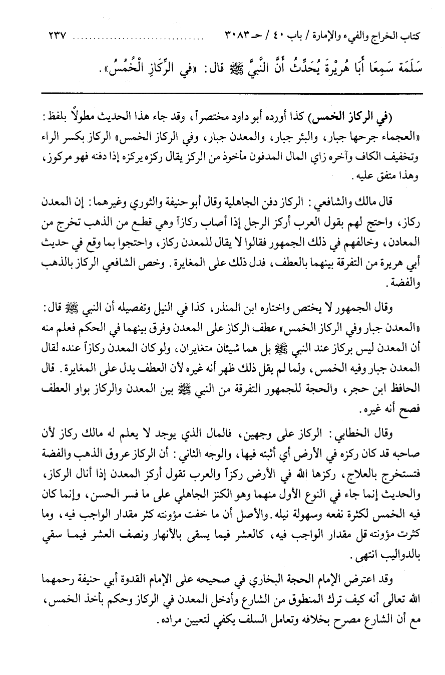 وَقَدِ اعْتَرَضَ الْإِمَامُ الْحُجَّةُ الْبُخَارِيُّ فِي صَحِيحِهِ عَلَى الْإِمَامِ الْقُدْوَةِ أَبِي حَنِيفَةَ رَحِمَهُمَا اللَّهُ تَعَالَى أَنَّهُ كَيْفَ تَرَكَ الْمَنْطُوقَ مِنَ الشَّارِعِ وَأَدْخَلَ الْمَعْدِنَ فِي الرِّكَازِ وَحَكَمَ بِأَخْذِ الْخُمُسِ مَعَ أَنَّ الشَّارِعَ مُصَرِّحٌ بِخِلَافِهِ وَتَعَامُلُ السَّلَفِ يَكْفِي لتعيين مراده