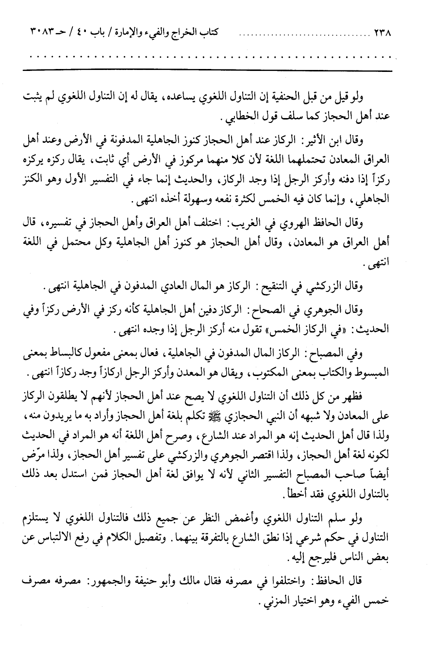 فَظَهَرَ مِنْ كُلِّ ذَلِكَ أَنَّ التَّنَاوُلَ اللُّغَوِيَّ لَا يَصِحُّ عِنْدَ أَهْلِ الْحِجَازِ لِأَنَّهُمْ لَا يُطْلِقُونَ الرِّكَازَ عَلَى الْمَعَادِنِ وَلَا شُبْهَةَ أَنَّ النَّبِيَّ الْحِجَازِيَّ صَلَّى اللَّهُ عَلَيْهِ وَسَلَّمَ تَكَلَّمَ بِلُغَةِ أَهْلِ الْحِجَازِ وَأَرَادَ بِهِ مَا يُرِيدُونَ مِنْهُ وَلِذَا قَالَ أَهْلُ الْحَدِيثِ إِنَّهُ هُوَ الْمُرَادُ عِنْدَ الشَّارِعِ وَصَرَّحَ أَهْلُ اللُّغَةِ أَنَّهُ هُوَ الْمُرَادُ فِي الْحَدِيثِ لِكَوْنِهِ لُغَةَ أَهْلِ الْحِجَازِ وَلِذَا اقْتَصَرَ الْجَوْهَرِيُّ وَالزَّرْكَشِيُّ عَلَى تَفْسِيرِ أَهْلِ الْحِجَازِ وَلِذَا مَرَّضَ أَيْضًا صَاحِبُ الْمِصْبَاحِ التَّفْسِيرَ الثَّانِي لِأَنَّهُ لَا يُوَافِقُ لُغَةَ أَهْلِ الْحِجَازِ فَمَنِ اسْتَدَلَّ بَعْدَ ذَلِكَ بِالتَّنَاوُلِ اللُّغَوِيِّ فَقَدْ أَخْطَأَ