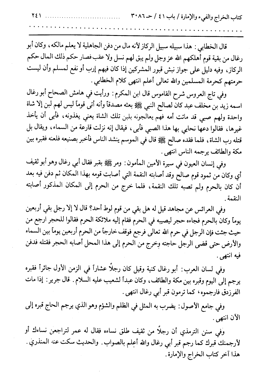 قَالَ الْخَطَّابِيُّ هَذَا سَبِيلُهُ سَبِيلُ الرِّكَازِ لِأَنَّهُ مَالٌ مِنْ دَفْنِ الْجَاهِلِيَّةِ لَا يُعْلَمُ مَالِكُهُ وَكَانَ أَبُو رِغَالٍ مِنْ بَقِيَّةِ قَوْمٍ أَهْلَكَهُمُ اللَّهُ عَزَّ وَجَلَّ وَلَمْ يَبْقَ لَهُمْ نَسْلٌ ولا عقب فصارحكم ذَلِكَ الْمَالِ حُكْمُ الرِّكَازِ وَفِيهِ دَلِيلٌ عَلَى جَوَازِ نَبْشِ قُبُورِ الْمُشْرِكِينَ إِذَا كَانَ فِيهِمْ إِرْبٌ أَوْ نَفْعٌ لِمُسْلِمٍ وَأَنْ لَيْسَتْ حُرْمَتُهُمْ كَحُرْمَةِ الْمُسْلِمِينَ وَاللَّهُ تَعَالَى أَعْلَمُ انْتَهَى كَلَامُ الْخَطَّابِيِّ