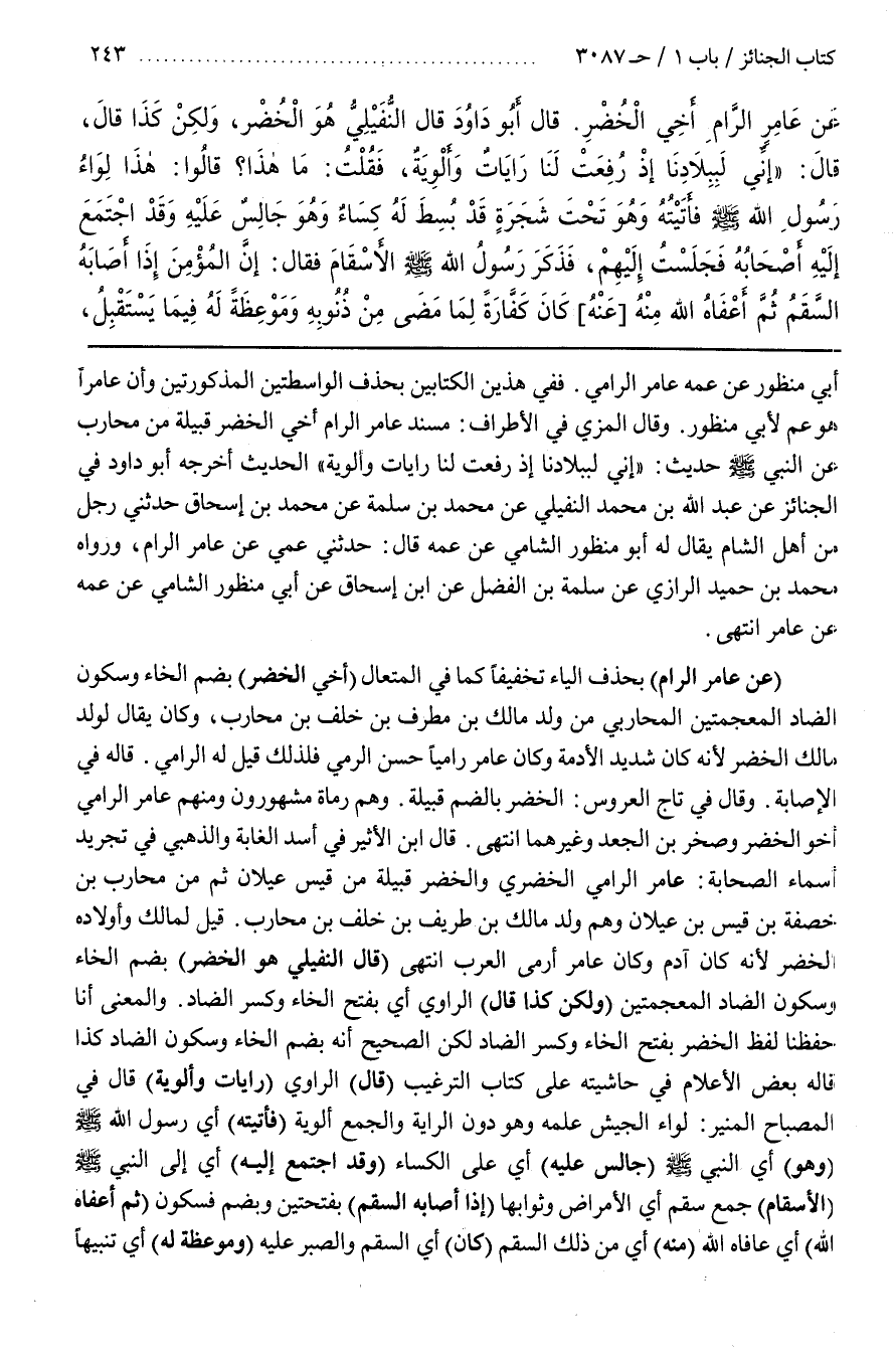 أَبِي مَنْظُورٍ عَنْ عَمِّهِ عَامِرٍ الرَّامِي فَفِي هَذَيْنِ الْكِتَابَيْنِ بِحَذْفِ الْوَاسِطَتَيْنِ الْمَذْكُورَتَيْنِ وَأَنَّ عَامِرًا هُوَ عَمٌّ لِأَبِي مَنْظُورٍ وَقَالَ الْمِزِّيُّ فِي الأطراف مسند عامر الرام أَخِي الْخُضْرِ قَبِيلَةٌ مِنْ مُحَارِبٍ عَنِ النَّبِيِّ صَلَّى اللَّهُ عَلَيْهِ وَسَلَّمَ حَدِيثٌ إِنِّي لَبِبِلَادِنَا إِذْ رُفِعَتْ لَنَا رَايَاتٌ وَأَلْوِيَةٌ الْحَدِيثُ أَخْرَجَهُ أَبُو دَاوُدَ فِي الْجَنَائِزِ عَنْ عَبْدِ اللَّهِ بْنِ مُحَمَّدٍ النُّفَيْلِيِّ عَنْ مُحَمَّدِ بْنِ سَلَمَةَ عَنْ مُحَمَّدِ بْنِ إِسْحَاقَ حَدَّثَنِي رَجُلٌ مِنْ أَهْلِ الشَّامِ يُقَالُ لَهُ أَبُو مَنْظُورٍ الشَّامِيُّ عَنْ عَمِّهِ قَالَ حَدَّثَنِي عَمِّي عَنْ عَامِرٍ الرام وَرَوَاهُ مُحَمَّدُ بْنُ حَمِيدٍ الرَّازِّيُّ عَنْ سَلَمَةَ بن الفضل عن بن إِسْحَاقَ عَنْ أَبِي مَنْظُورٍ الشَّامِيِّ عَنْ عَمِّهِ عَنْ عَامِرٍ انْتَهَى