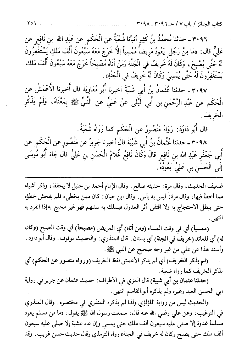 وَقَالَ الْمُنْذِرِيُّ فِي التَّرْغِيبِ وَعَنْ عَلِيٍّ رَضِيَ اللَّهُ عَنْهُ قَالَ سَمِعْتُ رَسُولَ اللَّهِ صَلَّى اللَّهُ عَلَيْهِ وَسَلَّمَ يَقُولُ مَا مِنْ مُسْلِمٍ يَعُودُ مُسْلِمًا غَدْوَةً إِلَّا صَلَّى عَلَيْهِ سَبْعُونَ أَلْفَ مَلَكٍ حَتَّى يُمْسِي وَإِنْ عَادَ عَشِيَّةً إِلَّا صَلَّى عَلَيْهِ سَبْعُونَ أَلْفَ مَلَكٍ حَتَّى يُصْبِحَ وَكَانَ لَهُ خَرِيفٌ فِي الْجَنَّةِ رَوَاهُ التِّرْمِذِيُّ وَقَالَ حَدِيثٌ حَسَنٌ غريب