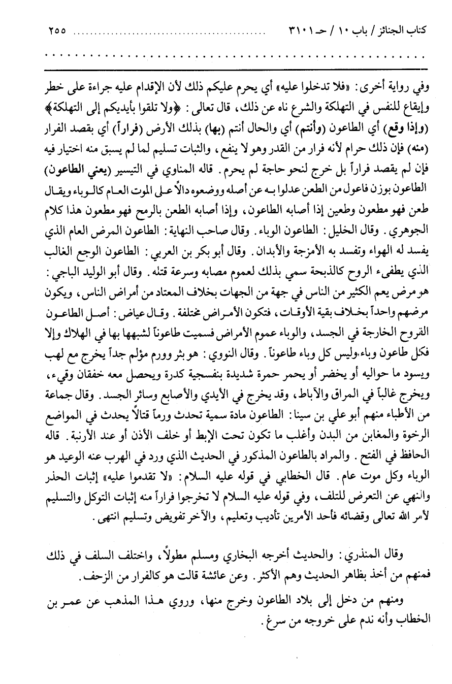 وَفِي رِوَايَةٍ أُخْرَى فَلَا تَدْخُلُوا عَلَيْهِ أَيْ يَحْرُمُ عَلَيْكُمْ ذَلِكَ لِأَنَّ الْإِقْدَامَ عَلَيْهِ جَرَاءَةٌ عَلَى خَطَرٍ وَإِيقَاعٌ لِلنَّفْسِ فِي التَّهْلُكَةِ وَالشَّرْعُ نَاهٍ عَنْ ذَلِكَ قَالَ تَعَالَى وَلَا تُلْقُوا بأيديكم إلى التهلكة (وَإِذَا وَقَعَ) أَيِ الطَّاعُونُ (وَأَنْتُمْ) أَيْ وَالْحَالُ أَنْتُمْ (بِهَا) بِذَلِكَ الْأَرْضِ (فِرَارًا) أَيْ بِقَصْدِ الْفِرَارِ (مِنْهُ) فَإِنَّ ذَلِكَ حَرَامٌ لِأَنَّهُ فِرَارٌ مِنَ الْقَدَرِ وَهُوَ لَا يَنْفَعُ وَالثَّبَاتُ تَسْلِيمٌ لِمَا لَمْ يَسْبِقْ مِنْهُ اخْتِيَارٌ فِيهِ فَإِنْ لَمْ يَقْصِدْ فِرَارًا بَلْ خَرَجَ لِنَحْوِ حَاجَةٍ لَمْ يَحْرُمْ