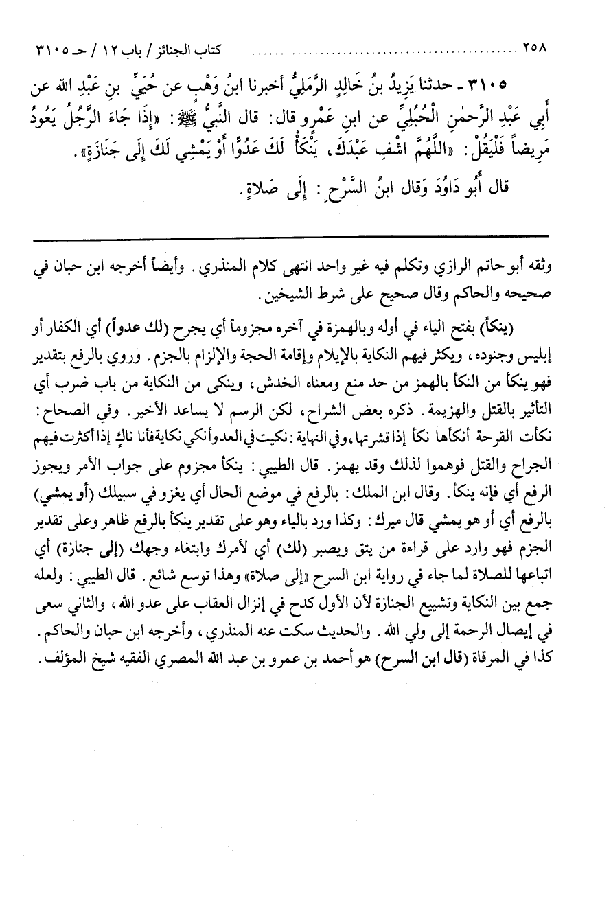 [3107] (يَنْكَأُ) بِفَتْحِ الْيَاءِ فِي أَوَّلِهِ وَبِالْهَمْزَةِ فِي آخِرِهِ مَجْزُومًا أَيْ يَجْرَحُ (لَكَ عَدُوًّا) أَيِ الْكُفَّارَ أَوْ إِبْلِيسَ وَجُنُودَهُ وَيُكْثِرُ فِيهِمُ النِّكَايَةَ بِالْإِيلَامِ وَإِقَامَةِ الْحُجَّةِ وَالْإِلْزَامِ بِالْجَزْمِ