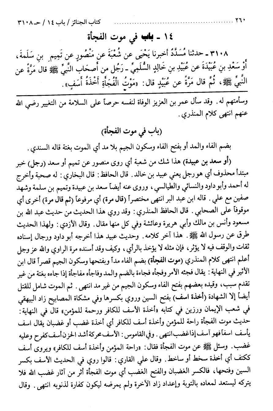 وَحَدِيثُ عُبَيْدٍ هَذَا أَخْرَجَهُ أَبُو دَاوُدَ وَرِجَالُ إِسْنَادِهِ ثِقَاتٌ وَالْوَقْفُ فِيهِ لَا يُؤَثِّرُ فَإِنَّ مِثْلَهُ لَا يُؤْخَذُ بِالرَّأْيِ وَكَيْفَ وَقَدْ أَسْنَدَهُ مَرَّةً الرَّاوِي وَاللَّهُ عَزَّ وَجَلَّ أَعْلَمُ انْتَهَى كَلَامُ الْمُنْذِرِيِّ (مَوْتُ الْفَجْأَةِ) بِضَمِّ الْفَاءِ مَدًّا وَبِفَتْحِهَا وَسُكُونِ الجيم قصرا قال بن الأثير في النهاية يقال فجئه الأمر وفجأة فجاءة بِالضَّمِّ وَالْمَدِّ وَفَاجَأَهُ مُفَاجَأَةً إِذَا جَاءَهُ بَغْتَةً مِنْ غَيْرِ تَقَدُّمِ سَبَبٍ وَقَيَّدَهُ بَعْضُهُمْ بِفَتْحِ الْفَاءِ وَسُكُونِ الْجِيمِ مِنْ غَيْرِ مَدٍّ انْتَهَى