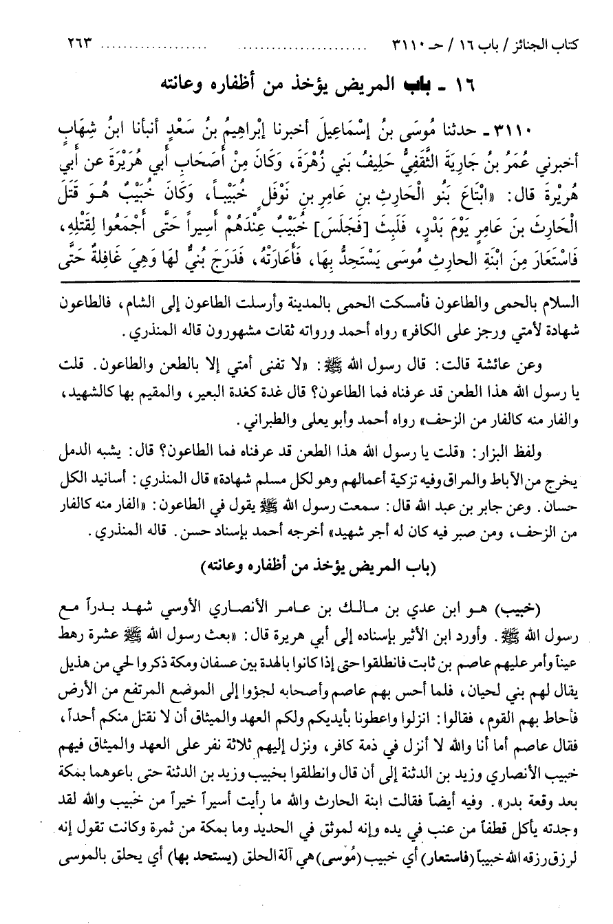 وَلَفْظُ الْبَزَّارِ قُلْتُ يَا رَسُولَ اللَّهِ هَذَا الطَّعْنُ قَدْ عَرَفْنَاهُ فَمَا الطَّاعُونُ قَالَ يُشْبِهُ الدُّمَّلَ يَخْرُجُ مِنَ الْآبَاطِ وَالْمَرَاقِ وَفِيهِ تَزْكِيَةُ أَعْمَالِهِمْ وَهُوَ لِكُلِّ مُسْلِمٍ شَهَادَةٌ قَالَ الْمُنْذِرِيُّ أَسَانِيدُ الْكُلِّ حِسَانٌ