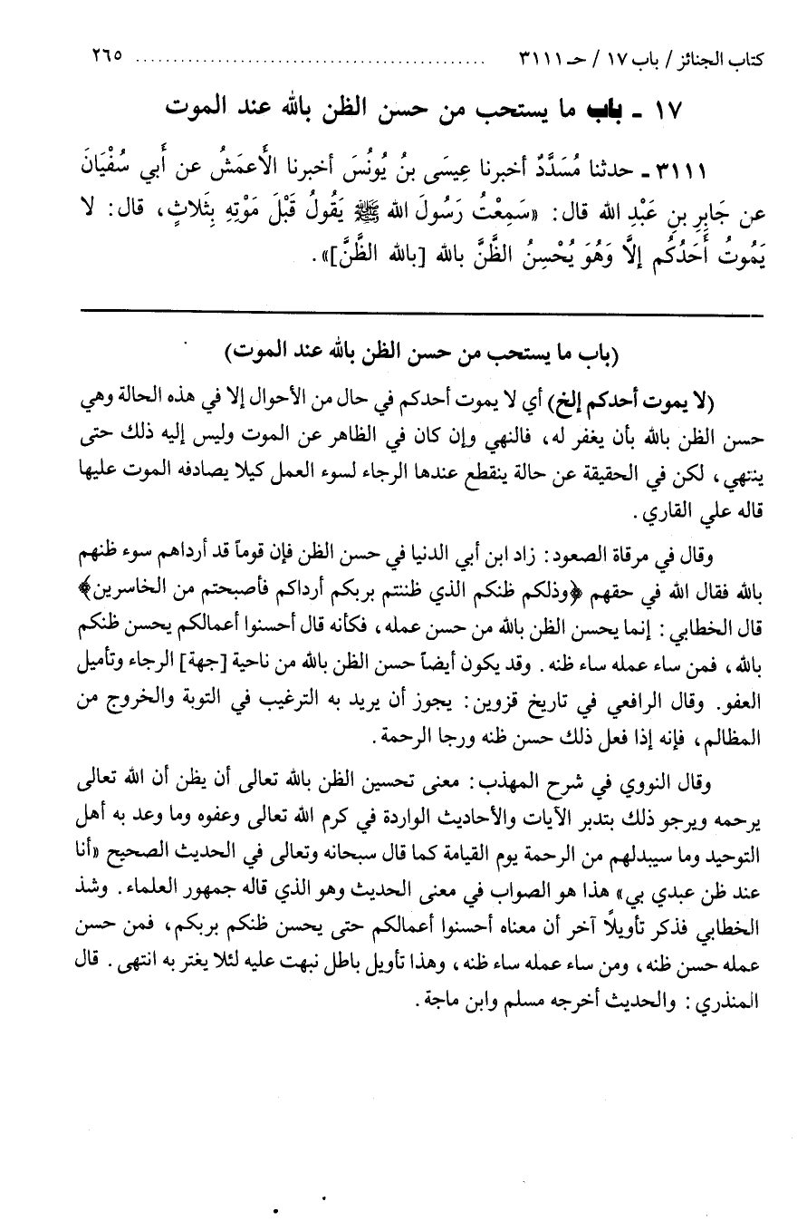 [3113] (لَا يَمُوتُ أَحَدُكُمْ إِلَخْ) أَيْ لَا يَمُوتُ أَحَدُكُمْ فِي حَالٍ مِنَ الْأَحْوَالِ إِلَّا فِي هَذِهِ الْحَالَةِ وَفِي حُسْنِ الظَّنِّ بِاللَّهِ بِأَنْ يَغْفِرَ لَهُ فَالنَّهْيُ وَإِنْ كَانَ فِي الظَّاهِرِ عَنِ الْمَوْتِ وَلَيْسَ إِلَيْهِ ذَلِكَ حَتَّى يَنْتَهِيَ لَكِنْ فِي الْحَقِيقَةِ عَنْ حَالَةٍ يَنْقَطِعُ عِنْدَهَا الرَّجَاءُ لِسُوءِ الْعَمَلِ كَيْلَا يُصَادِفُهُ الموت عليها قاله على القارىء