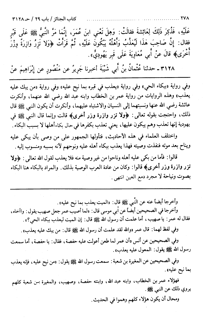 وَفِي رِوَايَةٍ بِبُكَاءِ الْحَيِّ وَفِي رِوَايَةٍ يُعَذَّبُ فِي قَبْرِهِ بِمَا نِيحَ عَلَيْهِ وَفِي رِوَايَةٍ مَنْ يُبْكَ عَلَيْهِ يُعَذَّبْ وَهَذِهِ الرِّوَايَاتُ مِنْ رِوَايَةِ عُمَرَ بْنِ الْخَطَّابِ وَابْنُهُ عَبْدُ اللَّهِ رَضِيَ اللَّهُ عَنْهُمَا وَأَنْكَرَتْ عَائِشَةُ رَضِيَ اللَّهُ عَنْهَا وَنَسَبَتْهُمَا إِلَى النِّسْيَانِ وَالِاشْتِبَاهِ عَلَيْهِمَا وَأَنْكَرَتْ أَنْ يَكُونَ النَّبِيُّ صَلَّى اللَّهُ عَلَيْهِ وَسَلَّمَ قَالَ ذَلِكَ وَاحْتَجَّتْ بِقَوْلِهِ تَعَالَى وَلَا تَزِرُ وازرة وزر أخرى قَالَتْ وَإِنَّمَا قَالَ النَّبِيُّ صَلَّى اللَّهُ عَلَيْهِ وَسَلَّمَ فِي يهوذية إِنَّهَا تُعَذَّبُ وَهُمْ يَبْكُونَ عَلَيْهَا يَعْنِي تُعَذَّبُ بكفرها في حال بكا أَهْلِهَا لَا بِسَبَبِ الْبُكَاءِ