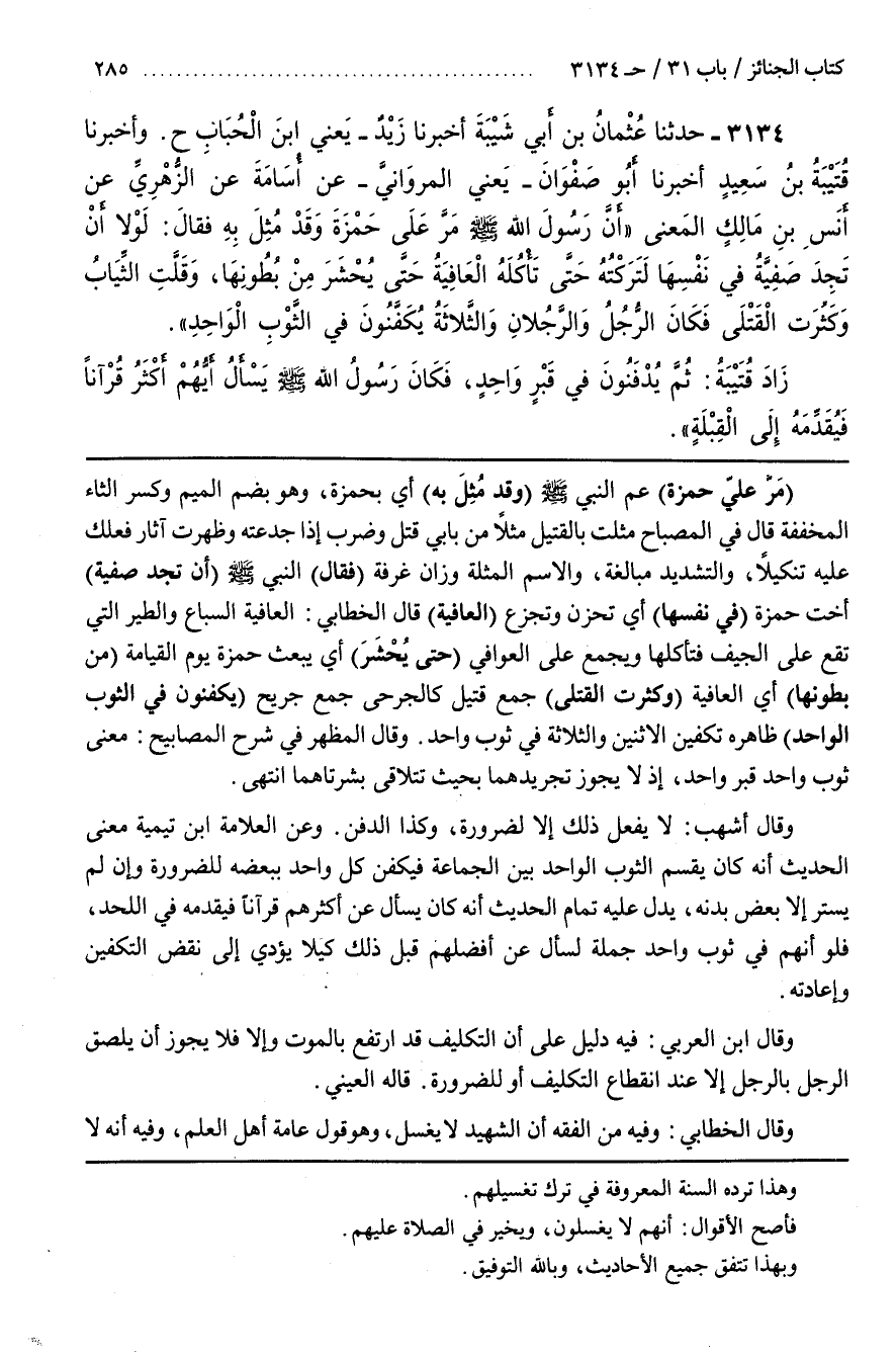 [3136] (مَرَّ عَلَى حَمْزَةَ) عَمِّ النَّبِيِّ صَلَّى اللَّهُ عَلَيْهِ وَسَلَّمَ (وَقَدْ مُثِّلَ بِهِ) أَيْ بِحَمْزَةَ وَهُوَ بِضَمِّ الْمِيمِ وَكَسْرِ الثَّاءِ الْمُخَفَّفَةِ قَالَ فِي الْمِصْبَاحِ مَثَّلْتُ بِالْقَتِيلِ مَثْلًا مِنْ بَابَيْ قَتَلَ وَضَرَبَ إِذَا جَدَعْتَهُ وَظَهَرَتْ آثَارُ فِعْلِكَ عَلَيْهِ تَنْكِيلًا وَالتَّشْدِيدُ مُبَالَغَةٌ وَالِاسْمُ الْمُثْلَةُ وِزَانُ غُرْفَةٍ (فَقَالَ) النَّبِيُّ صَلَّى اللَّهُ عَلَيْهِ وَسَلَّمَ (إِنَّ تَجِدَ صَفِيَّةَ) أُخْتَ حَمْزَةَ (فِي نَفْسِهَا) أَيْ تَحْزَنَ وَتَجْزَعَ (الْعَافِيَةُ) قَالَ الْخَطَّابِيُّ الْعَافِيَةُ السِّبَاعُ وَالطَّيْرُ الَّتِي تَقَعُ عَلَى الْجِيَفِ فَتَأْكُلُهَا وَيُجْمَعُ عَلَى الْعَوَافِي (حَتَّى يُحْشَرَ) أَيْ يُبْعَثَ حَمْزَةُ يَوْمَ الْقِيَامَةِ (مِنْ بُطُونِهَا) أَيِ الْعَافِيَةِ وَكَثُرَتِ الْقَتْلَى جَمْعُ قَتِيلٍ كَالْجَرْحَى جَمْعُ جَرِيحٍ (يُكَفَّنُونَ فِي الثَّوْبِ الْوَاحِدِ) ظَاهِرُهُ تَكْفِينُ الِاثْنَيْنِ وَالثَّلَاثَةِ فِي ثَوْبٍ وَاحِدٍ