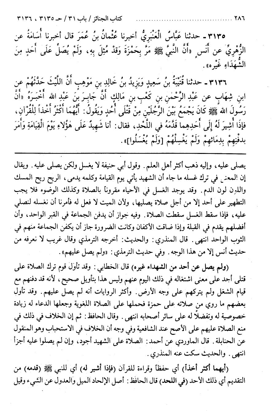 [3137] (وَلَمْ يُصَلِّ عَلَى أَحَدٍ مِنَ الشُّهَدَاءِ غَيْرِهِ) قَالَ الْخَطَّابِيُّ وَقَدْ تَأَوَّلَ قَوْمٌ تَرْكَ الصَّلَاةِ عَلَى قَتْلَى أُحُدٍ عَلَى مَعْنَى اشْتِغَالِهِ فِي ذَلِكَ الْيَوْمِ عَنْهُمْ وَلَيْسَ هَذَا بِتَأْوِيلٍ صَحِيحٍ لِأَنَّهُ قَدْ دَفَنَهُمْ مَعَ قِيَامِ الشُّغْلِ وَلَمْ يَتْرُكْهُمْ عَلَى وَجْهِ الْأَرْضِ