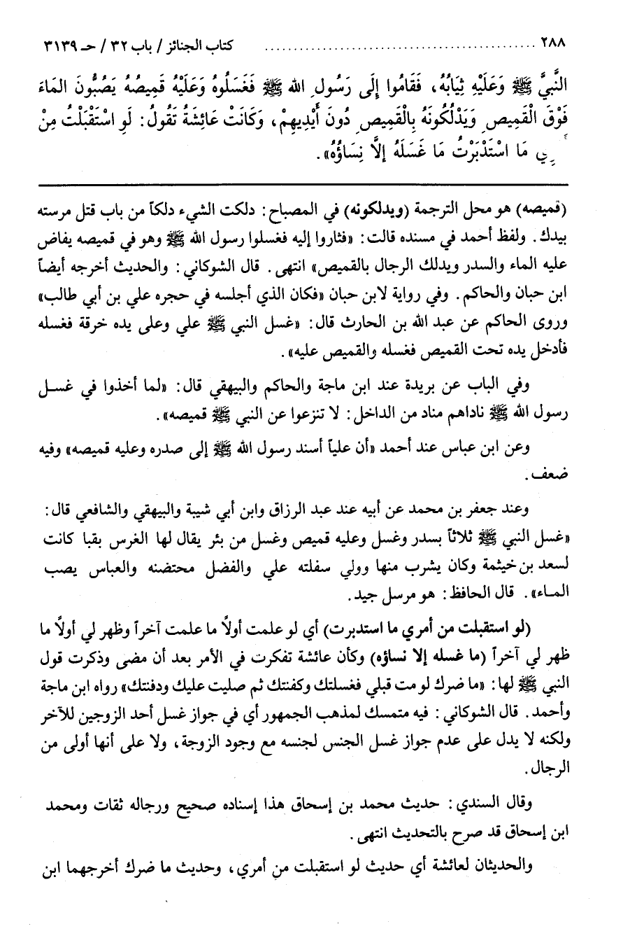 وَلَفْظُ أَحْمَدَ فِي مُسْنَدِهِ قَالَتْ فَثَارُوا إِلَيْهِ فَغَسَلُوا رَسُولَ اللَّهِ صَلَّى اللَّهُ عَلَيْهِ وَسَلَّمَ وَهُوَ فِي قَمِيصِهِ يُفَاضُ عَلَيْهِ الْمَاءُ وَالسِّدْرُ وَيَدْلُكُ الرِّجَالُ بِالْقَمِيصِ انْتَهَى