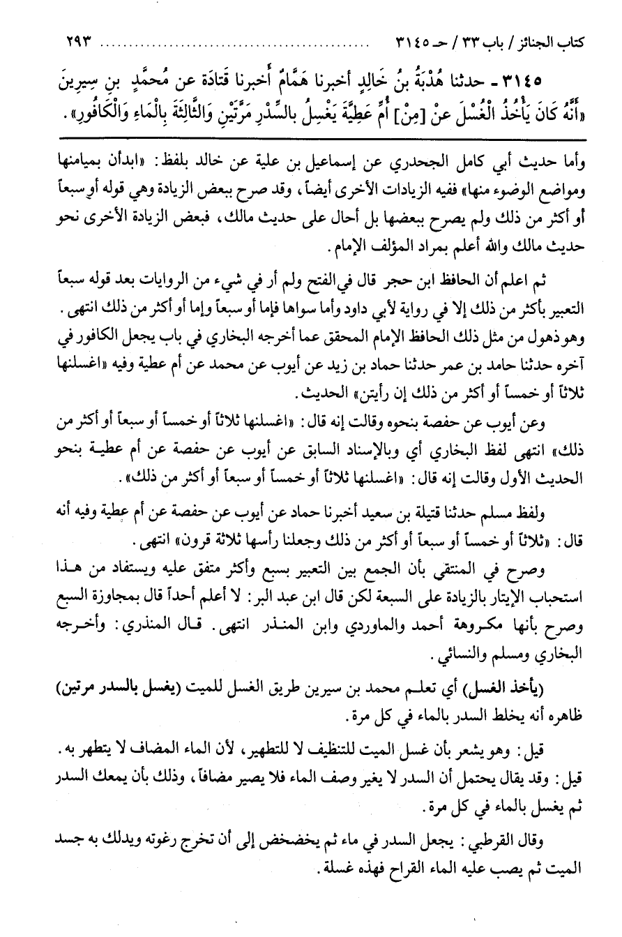 وَهُوَ ذُهُولٌ مِنْ مِثْلِ ذَلِكَ الْحَافِظِ الْإِمَامِ الْمُحَقِّقِ عَمَّا أَخْرَجَهُ الْبُخَارِيُّ فِي بَابِ يُجْعَلُ الْكَافُورُ فِي آخِرِهِ حَدَّثَنَا حَامِدُ بْنُ عُمَرَ حَدَّثَنَا حَمَّادُ بْنُ زَيْدٍ عَنْ أَيُّوبَ عَنْ مُحَمَّدٍ عَنْ أُمِّ عَطِيَّةَ وَفِيهِ اغْسِلْنَهَا ثَلَاثًا أَوْ خَمْسًا أَوْ أَكْثَرَ مِنْ ذَلِكَ إِنْ رَأَيْتُنَّ الْحَدِيثَ