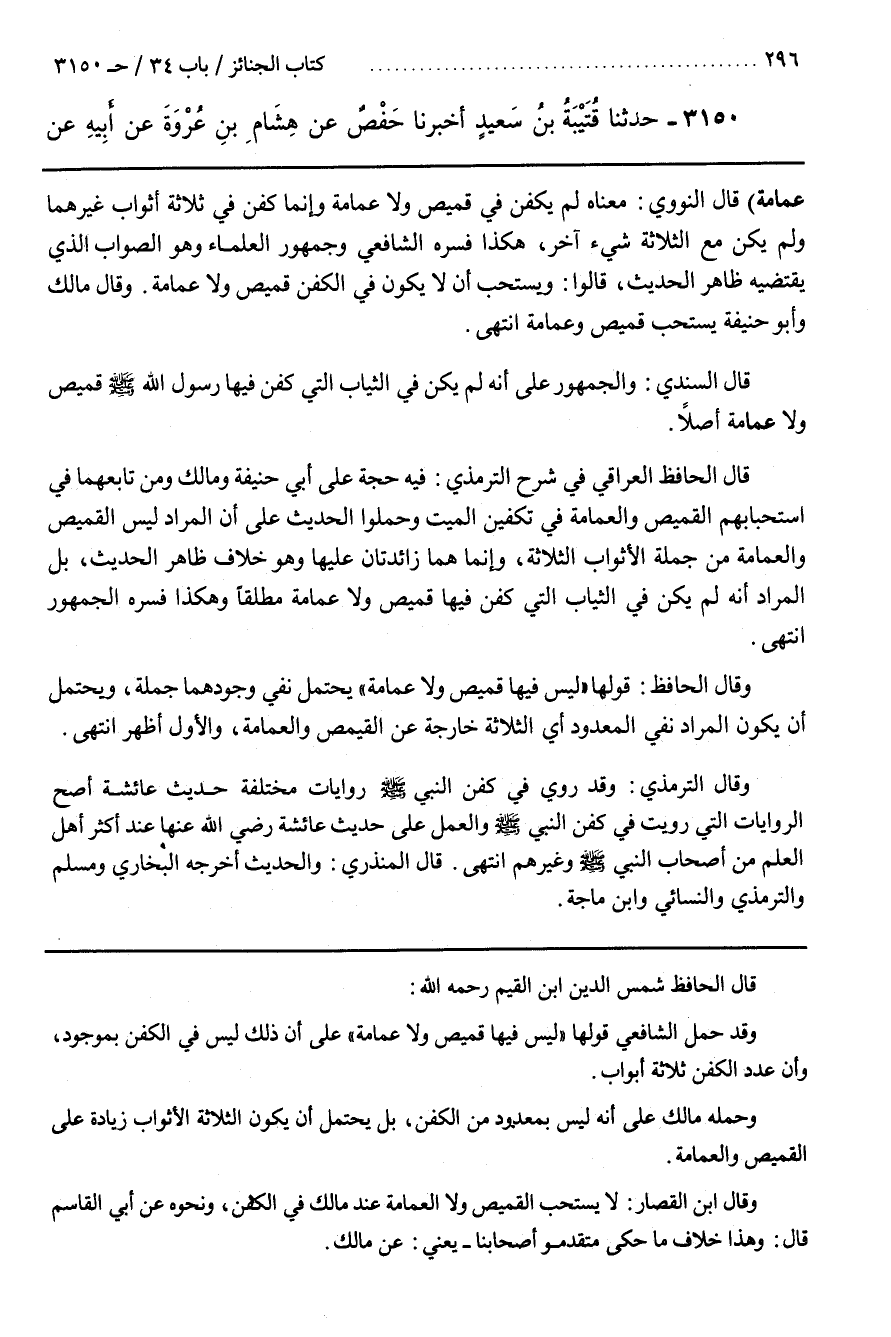 عمامة) قال النَّوَوِيَّ مَعْنَاهُ لَمْ يُكَفَّنْ فِي قَمِيصٍ وَلَا عِمَامَةٍ وَإِنَّمَا كُفِّنَ فِي ثَلَاثَةِ أَثْوَابٍ غَيْرِهِمَا وَلَمْ يَكُنْ مَعَ الثَّلَاثَةِ شَيْءٌ آخَرُ هَكَذَا فَسَّرَهُ الشَّافِعِيُّ وَجُمْهُورُ الْعُلَمَاءِ وَهُوَ الصَّوَابُ الَّذِي يَقْتَضِيهِ ظَاهِرُ الْحَدِيثِ قَالُوا وَيُسْتَحَبُّ أَنْ لَا يَكُونَ فِي الْكَفَنِ قَمِيصٌ وَلَا عِمَامَةٌ