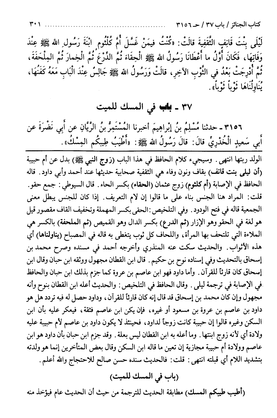 وقال الحافظ في التلخيص والحديث أعله بن الْقَطَّانِ بِنُوحٍ وَأَنَّهُ مَجْهُولٌ وَإِنْ كَانَ مُحَمَّدُ بْنُ إِسْحَاقَ قَدْ قَالَ إِنَّهُ كَانَ قَارِئًا لِلْقُرْآنِ وَدَاوُدُ حَصَلَ لَهُ فِيهِ تَرَدُّدٌ هَلْ هُوَ دَاوُدُ بْنُ عَاصِمِ بْنِ عُرْوَةَ بْنِ مسعود أو غيره فإن يكن بن عاصم فثقة فيعكر عليه بأن بن السَّكَنِ وَغَيْرَهُ قَالُوا إِنَّ حَبِيبَةَ كَانَتْ زَوْجًا لِداوُدَ فَحِينَئِذٍ لَا يَكُونُ دَاوُدُ بْنُ عَاصِمٍ لِأُمِّ حَبِيبَةَ عَلَيْهِ وِلَادَةٌ أَيْ لِأَنَّهُ زَوْجُ ابنتها