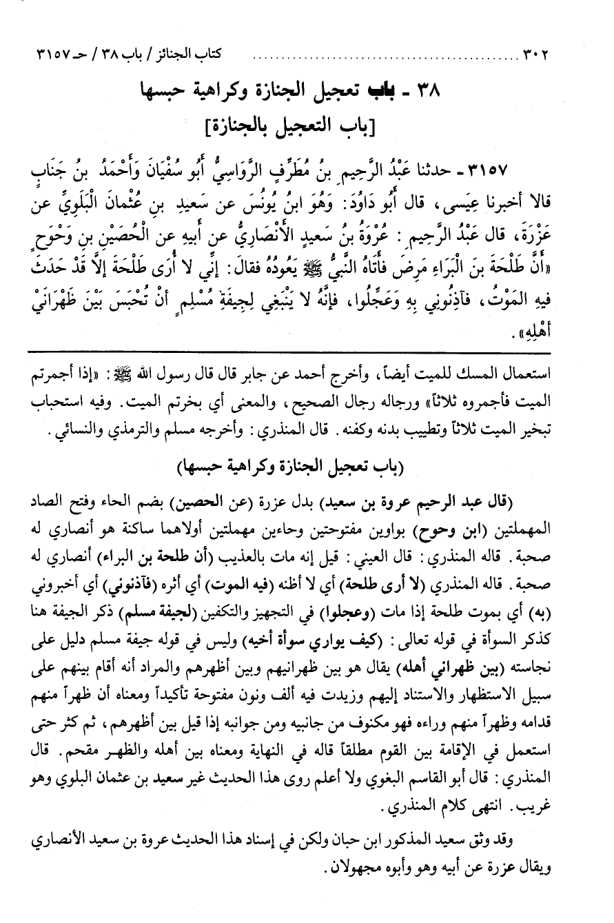 قَالَهُ الْمُنْذِرِيُّ (لَا أَرَى طَلْحَةَ) أَيْ لَا أَظُنُّهُ (فِيهِ الْمَوْتُ) أَيْ أَثَرُهُ (فَآذِنُونِي) أَيْ أَخْبِرُونِي (بِهِ) أَيْ بِمَوْتِ طَلْحَةَ إِذَا مَاتَ (وَعَجِّلُوا) فِي التَّجْهِيزِ وَالتَّكْفِينِ (لِجِيفَةِ مُسْلِمٍ) ذِكْرُ الْجِيفَةِ هُنَا كذكر السوأة فِي قَوْلِهِ تَعَالَى (كَيْفَ يُوَارِي سَوْأَةَ أَخِيهِ) وَلَيْسَ فِي قَوْلِهِ جِيفَةُ مُسْلِمٍ دَلِيلٌ عَلَى نَجَاسَتِهِ (بَيْنَ ظَهْرَانَيْ أَهْلِهِ) يُقَالُ هُوَ بَيْنَ ظَهْرَانَيْهِمْ وَبَيْنَ أَظْهُرِهِمْ وَالْمُرَادُ أَنَّهُ أَقَامَ بَيْنَهُمْ عَلَى سَبِيلِ الِاسْتِظْهَارِ وَالِاسْتِنَادِ إِلَيْهِمْ وَزِيدَتْ فِيهِ أَلِفٌ وَنُونٌ مَفْتُوحَةٌ تَأْكِيدًا وَمَعْنَاهُ أَنَّ ظَهْرًا مِنْهُمْ قُدَّامَهُ وَظَهْرًا مِنْهُمْ وَرَاءَهُ فَهُوَ مَكْنُوفٌ مِنْ جَانِبَيْهِ وَمِنْ جَوَانِبِهِ إِذَا قِيلَ بَيْنَ أَظْهُرِهِمْ ثُمَّ كَثُرَ حَتَّى اسْتُعْمِلَ فِي الْإِقَامَةِ بَيْنَ الْقَوْمِ مُطْلَقًا قَالَهُ فِي النِّهَايَةِ وَمَعْنَاهُ بَيْنَ أَهْلِهِ وَالظَّهْرُ مُقْحَمٌ