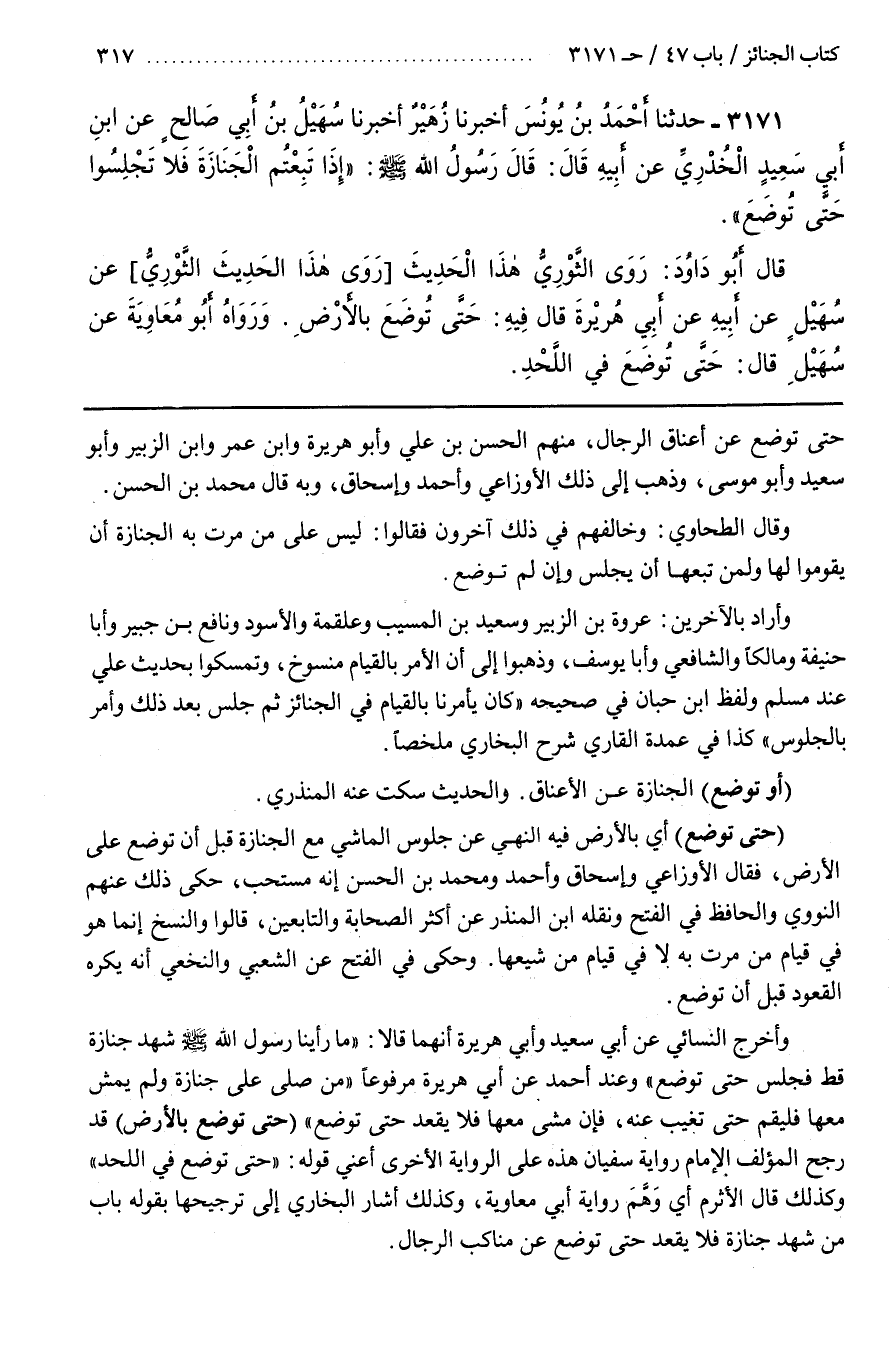 [3173] (حَتَّى تُوضَعَ) أَيْ بِالْأَرْضِ فِيهِ النَّهْيُ عَنْ جُلُوسِ الْمَاشِي مَعَ الْجِنَازَةِ قَبْلَ أَنْ تُوضَعَ عَلَى الْأَرْضِ فَقَالَ الْأَوْزَاعِيُّ وَإِسْحَاقُ وَأَحْمَدُ وَمُحَمَّدُ بْنُ الْحَسَنِ إِنَّهُ مُسْتَحَبٌّ حَكَى ذَلِكَ عَنْهُمُ النَّوَوِيُّ وَالْحَافِظُ في الفتح ونقله بن الْمُنْذِرِ عَنْ أَكْثَرِ الصَّحَابَةِ وَالتَّابِعِينَ قَالُوا وَالنَّسْخُ إِنَّمَا هُوَ فِي قِيَامِ مَنْ مَرَّتْ بِهِ لَا فِي قِيَامِ مَنْ شَيَّعَهَا