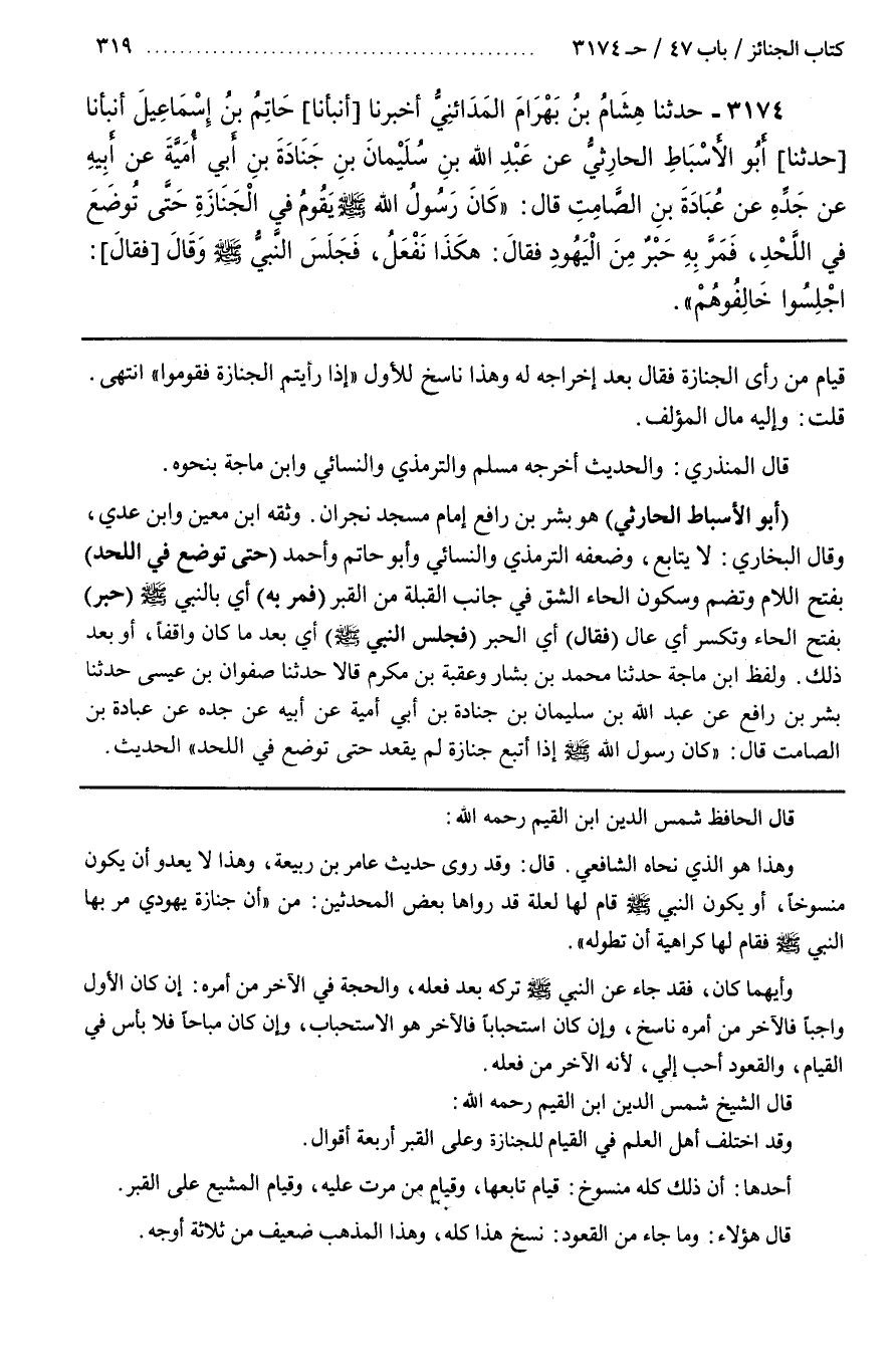 ولفظ بن مَاجَهْ حَدَّثَنَا مُحَمَّدُ بْنُ بَشَّارٍ وَعُقْبَةُ بْنُ مُكْرَمٍ قَالَا حَدَّثَنَا صَفْوَانُ بْنُ عِيسَى حَدَّثَنَا بِشْرُ بْنُ رَافِعٍ عَنْ عَبْدِ اللَّهِ بْنِ سُلَيْمَانَ بْنِ جُنَادَةَ بْنِ أَبِي أُمَيَّةَ عَنْ أَبِيهِ عَنْ جَدِّهِ عَنْ عُبَادَةَ بْنِ الصَّامِتِ قَالَ كَانَ رَسُولُ اللَّهِ صَلَّى اللَّهُ عَلَيْهِ وَسَلَّمَ إِذَا اتَّبَعَ جِنَازَةً لَمْ يَقْعُدْ حَتَّى تُوضَعَ فِي اللَّحْدِ الْحَدِيثَ