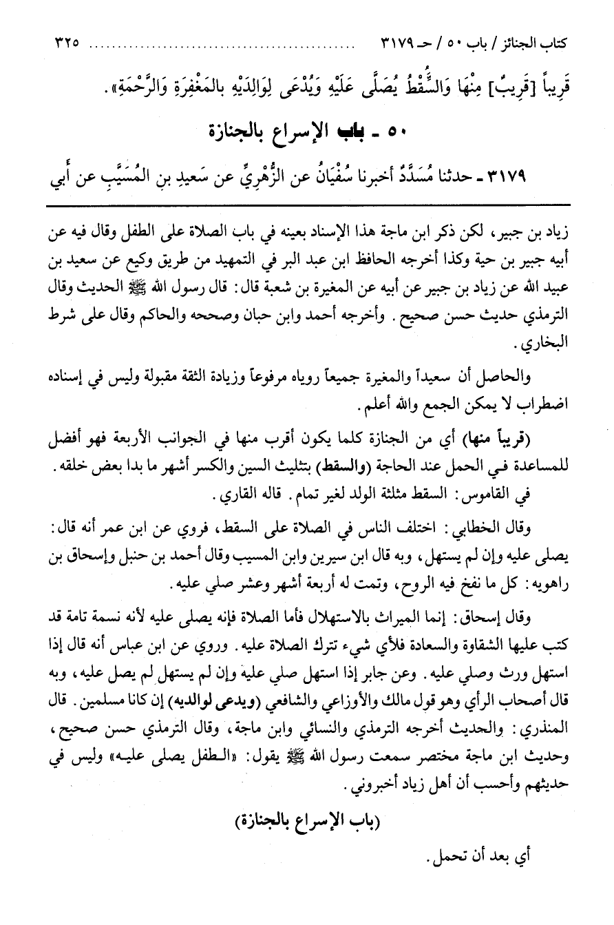 زياد بن جبير لكن ذكر بن مَاجَهْ هَذَا الْإِسْنَادَ بِعَيْنِهِ فِي بَابِ الصَّلَاةِ عَلَى الطِّفْلِ وَقَالَ فِيهِ عَنْ أَبِيهِ جُبَيْرِ بْنِ حَيَّةَ وَكَذَا أَخْرَجَهُ الْحَافِظُ بْنُ عَبْدِ الْبَرِّ فِي التَّمْهِيدِ مِنْ طَرِيقِ وَكِيعٍ عَنْ سَعِيدِ بْنِ عُبَيْدِ اللَّهِ عَنْ زِيَادِ بْنِ جُبَيْرٍ عَنْ أَبِيهِ عَنِ الْمُغِيرَةِ بْنِ شُعْبَةَ قَالَ قَالَ رَسُولُ اللَّهِ صَلَّى اللَّهُ عَلَيْهِ وَسَلَّمَ الْحَدِيثَ وَقَالَ التِّرْمِذِيُّ حَدِيثٌ حَسَنٌ صَحِيحٌ