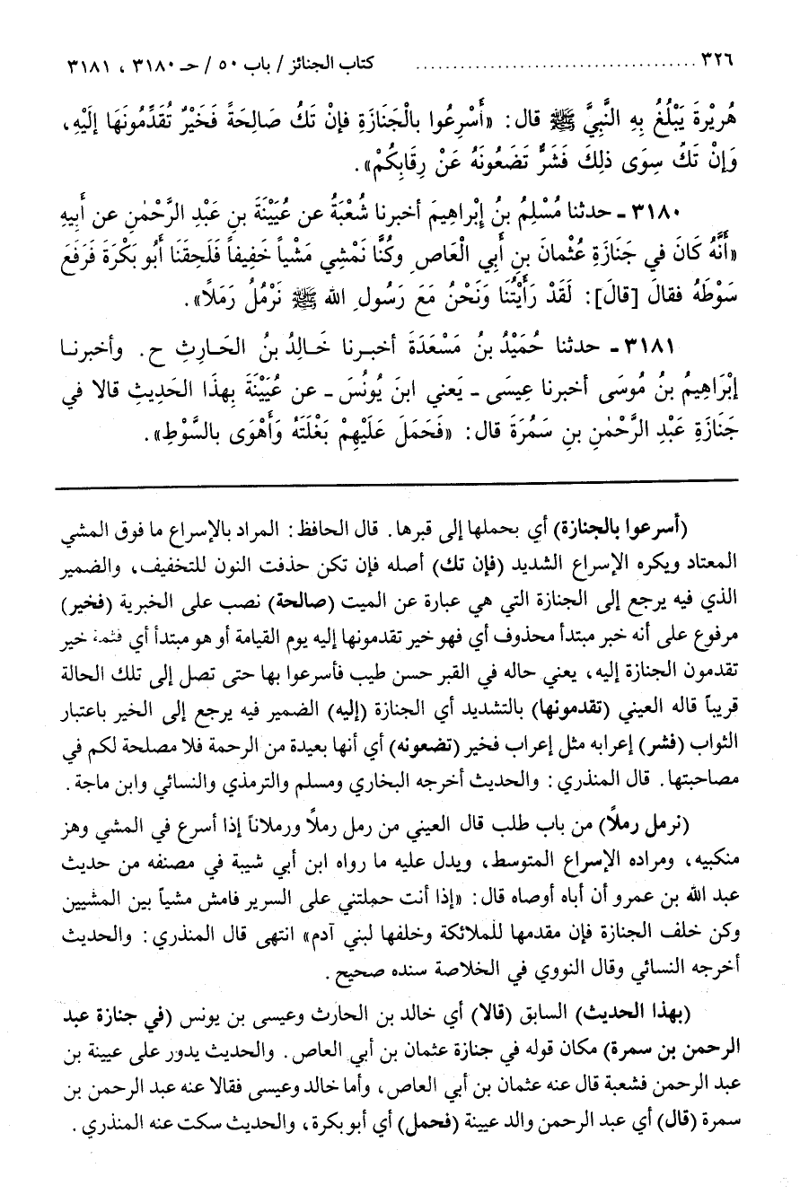 [3182] (نَرْمُلُ رَمَلًا) مِنْ بَابِ طَلَبَ قَالَ الْعَيْنِيُّ مِنْ رَمَلَ رَمَلًا وَرَمَلَانًا إِذَا أَسْرَعَ فِي الْمَشْيِ وَهَزَّ مَنْكِبَيْهِ وَمُرَادُهُ الْإِسْرَاعُ الْمُتَوَسِّطُ ويدل عليه ما رواه بن أَبِي شَيْبَةَ فِي مُصَنَّفِهِ مِنْ حَدِيثِ عَبْدِ اللَّهِ بْنِ عَمْرٍو أَنَّ أَبَاهُ أَوْصَاهُ قَالَ إِذَا أَنْتَ حَمَلْتَنِي عَلَى السَّرِيرِ فَامْشِ مَشْيًا بَيْنَ الْمَشْيَيْنِ وَكُنْ خَلْفَ الْجِنَازَةِ فَإِنَّ مُقَدَّمَهَا لِلْمَلَائِكَةِ وَخَلْفَهَا لِبَنِي آدَمَ انْتَهَى قَالَ الْمُنْذِرِيُّ وَالْحَدِيثُ أَخْرَجَهُ النَّسَائِيُّ وَقَالَ النَّوَوِيُّ فِي الْخُلَاصَةِ سَنَدُهُ صَحِيحٌ