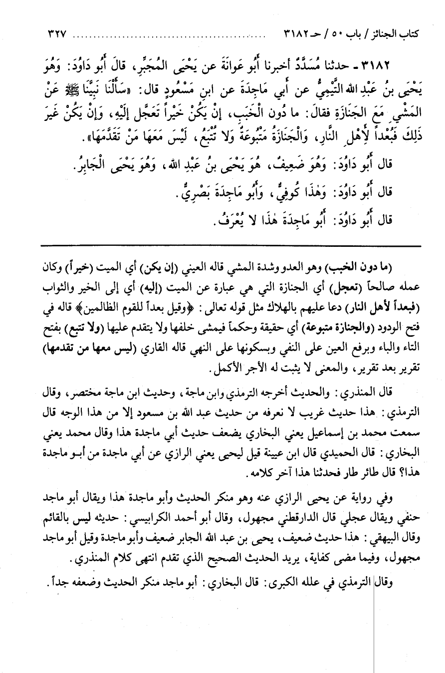 قَالَ المنذري والحديث أخرجه الترمذي وبن ماجه وحديث بن مَاجَهْ مُخْتَصَرٌ وَقَالَ التِّرْمِذِيُّ هَذَا حَدِيثٌ غَرِيبٌ لَا نَعْرِفُهُ مِنْ حَدِيثِ عَبْدِ اللَّهِ بْنِ مَسْعُودٍ إِلَّا مِنْ هَذَا الْوَجْهِ قَالَ سَمِعْتُ مُحَمَّدَ بْنَ إِسْمَاعِيلَ يَعْنِي الْبُخَارِيَّ يُضَعِّفُ حَدِيثَ أَبِي مَاجِدَةَ هَذَا وَقَالَ مُحَمَّدٌ يَعْنِي الْبُخَارِيَّ قال الحميدي قال بن عُيَيْنَةَ قِيلَ لِيَحْيَى يَعْنِي الرَّازِيَّ عَنْ أَبِي مَاجِدَةَ مَنْ أَبُو مَاجِدَةَ هَذَا قَالَ طَائِرٌ طَارَ فَحَدَّثَنَا هَذَا آخِرُ كَلَامِهِ