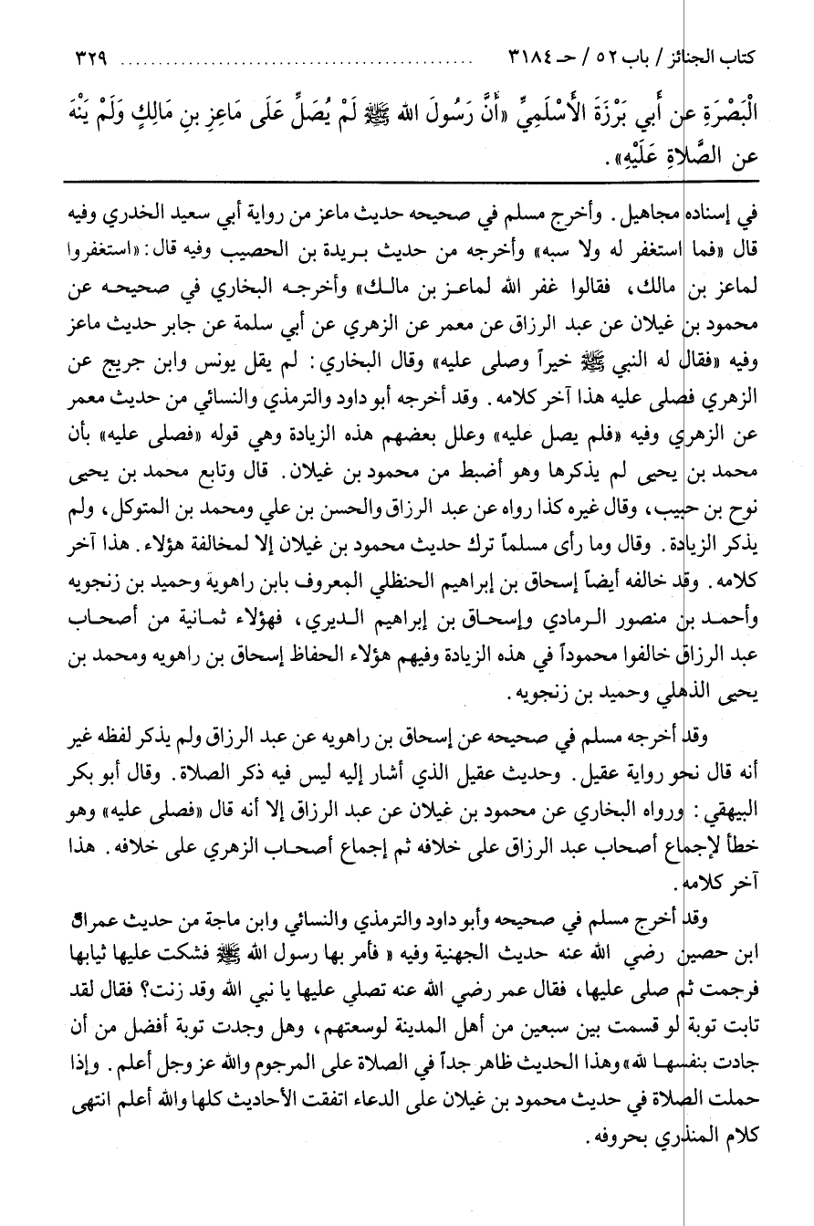 وَأَخْرَجَ مُسْلِمٌ فِي صَحِيحِهِ حَدِيثَ مَاعِزٍ مِنْ رِوَايَةِ أَبِي سَعِيدٍ الْخُدْرِيِّ وَفِيهِ قَالَ فَمَا اسْتَغْفَرَ لَهُ وَلَا سَبَّهُ وَأَخْرَجَهُ مِنْ حَدِيثِ بُرَيْدَةَ بْنِ الْحُصَيْبِ وَفِيهِ قال استغفر والماعز بْنِ مَالِكٍ فَقَالُوا غَفَرَ اللَّهُ لِمَاعِزِ بْنِ مَالِكٍ وَأَخْرَجَهُ الْبُخَارِيُّ فِي صَحِيحِهِ عَنْ مَحْمُودِ بْنِ غَيْلَانَ عَنْ عَبْدِ الرَّزَّاقِ عَنْ مَعْمَرٌ عَنِ الزُّهْرِيِّ عَنْ أَبِي سَلَمَةَ عَنْ جَابِرٍ حَدِيثَ مَاعِزٍ وَفِيهِ فَقَالَ لَهُ النَّبِيُّ صَلَّى اللَّهُ عَلَيْهِ وَسَلَّمَ خَيْرًا وَصَلَّى عَلَيْهِ وَقَالَ البخاري لم يقل يونس وبن جُرَيْجٍ عَنِ الزُّهْرِيِّ فَصَلَّى عَلَيْهِ هَذَا آخِرُ كَلَامِهِ