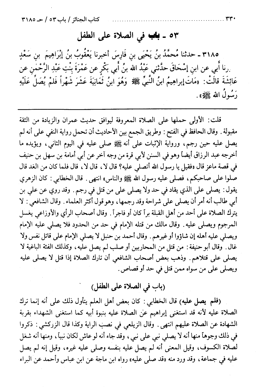 [3187] (فَلَمْ يُصَلِّ عَلَيْهِ) قَالَ الْخَطَّابِيُّ كَانَ بَعْضُ أَهْلِ الْعِلْمِ يَتَأَوَّلُ ذَلِكَ عَلَى أَنَّهُ إِنَّمَا تَرَكَ الصَّلَاةَ عَلَيْهِ لِأَنَّهُ قَدِ اسْتَغْنَى إِبْرَاهِيمُ عَنِ الصَّلَاةِ عَلَيْهِ بِنُبُوَّةِ أَبِيهِ كَمَا اسْتَغْنَى الشُّهَدَاءُ بِقُرْبَةِ الشَّهَادَةِ عَنِ الصَّلَاةِ عَلَيْهِمُ انْتَهَى