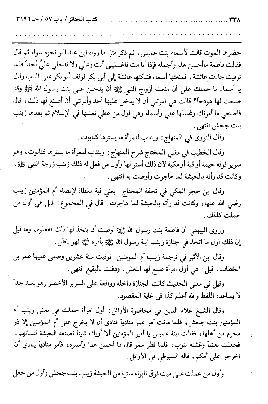 وَقَالَ الشَّيْخُ عَلَاءُ الدِّينِ فِي مُحَاضَرَةِ الْأَوَائِلِ أَوَّلُ امْرَأَةٍ حُمِلَتْ فِي نَعْشٍ زَيْنَبُ أُمُّ الْمُؤْمِنِينَ بِنْتُ جَحْشٍ فَلَمَّا مَاتَتْ أَمَرَ عُمَرُ مُنَادِيًا فَنَادَى أَنْ لَا يَخْرُجَ عَلَى أُمِّ الْمُؤْمِنِينَ إِلَّا ذُو مَحْرَمٍ مِنْ أَهْلِهَا فَقَالَتْ ابْنَةُ عُمَيْسٍ يَا أَمِيرَ الْمُؤْمِنِينَ أَلَا أُرِيكَ شَيْئًا تَصْنَعُهُ الْحَبَشَةُ لِنِسَائِهِمْ فَجَعَلَتْ نَعْشًا وَغَشَّتْهُ بِثَوْبٍ فَلَمَّا نَظَرَ عُمَرُ قَالَ مَا أَحْسَنَ هَذَا وَأَسْتَرَهُ فَأَمَرَ مُنَادِيًا يُنَادِي أَنِ اخْرُجُوا عَلَى أُمِّكُمْ