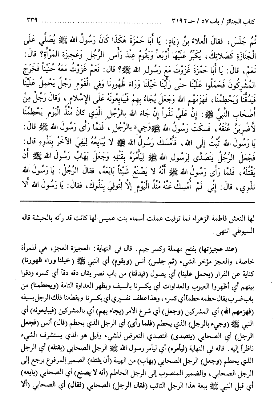 قَالَ فِي النِّهَايَةِ الْعَجِيزَةُ الْعَجُزُ وَهِيَ لِلْمَرْأَةِ خَاصَّةً وَالْعَجُزُ مُؤَخَّرُ الشَّيْءِ (ثُمَّ جَلَسَ) أَنَسٌ (وَيَقُومُ) أَيِ النَّبِيُّ صَلَّى اللَّهُ عَلَيْهِ وَسَلَّمَ (خَيْلَنَا وَرَاءَ ظُهُورِنَا) كِنَايَةٌ عَنِ الْفِرَارِ (يَحْمِلُ عَلَيْنَا) أَيْ يَصُولُ (فَيَدُقُّنَا) مِنْ بَابِ نَصَرَ يُقَالُ دَقَّهُ دَقًّا أَيْ كَسَرَهُ وَدَقُّوا بَيْنَهُمْ أَيْ أَظْهَرُوا الْعُيُوبَ وَالْعَدَاوَاتِ أَيْ يَكْسِرُنَا بِالسَّيْفِ وَيُظْهِرُ الْعَدَاوَةَ التَّامَّةَ (وَيَحْطِمُنَا) مِنْ بَابِ ضَرَبَ يُقَالُ حَطَمَهُ حَطْمًا أَيْ كَسَرَهُ وَهَذَا عَطْفٌ تَفْسِيرِيٌّ أَيْ يَكْسِرُنَا وَيَقْطَعُنَا ذَلِكَ الرَّجُلُ بِسَيْفِهِ (فَهَزَمَهُمُ اللَّهُ) أَيِ الْمُشْرِكِينَ (وَجَعَلَ) أَيْ شَرَعَ الْأَمْرَ (يُجَاءُ بِهِمْ) أَيْ بِالْمُشْرِكِينَ (فَيُبَايِعُونَهُ) أَيِ النَّبِيَّ صَلَّى اللَّهُ عَلَيْهِ وَسَلَّمَ (وَجِيءَ بِالرَّجُلِ) الَّذِي يَحْطِمُ (فَلَمَّا رَأَى) أَيِ الرَّجُلُ الَّذِي يَحْطِمُ (قَالَ) أَنَسٌ (فَجَعَلَ الرَّجُلُ) أَيِ الصَّحَابِيُّ (يَتَصَدَّى) التَّصَدِّي التَّعَرُّضُ لِلشَّيْءِ وَقِيلَ هُوَ الَّذِي يَسْتَشْرِفُ الشَّيْءَ نَاظِرًا إِلَيْهِ