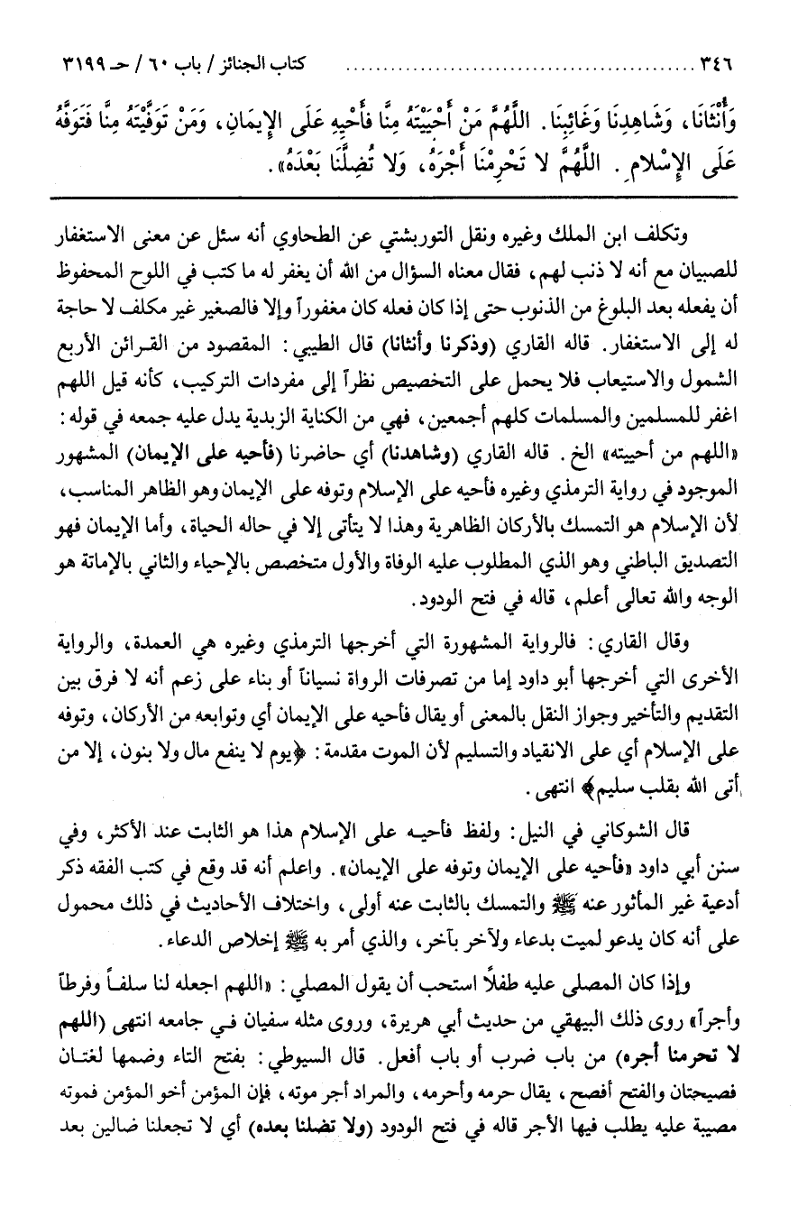 قَالَ الشَّوْكَانِيُّ فِي النَّيْلِ وَلَفْظُ فَأَحْيِهِ عَلَى الْإِسْلَامِ هَذَا هُوَ الثَّابِتُ عِنْدَ الْأَكْثَرِ وَفِي سُنَنِ أَبِي دَاوُدَ فَأَحْيِهِ عَلَى الْإِيمَانِ وَتَوَفَّهُ عَلَى الْإِيمَانِ