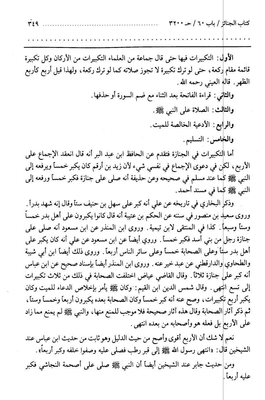 أَمَّا التَّكْبِيرَاتُ فِي الْجِنَازَةِ فَتَقَدَّمَ عَنِ الْحَافِظِ بْنِ عَبْدِ الْبَرِّ أَنَّهُ قَالَ انْعَقَدَ الْإِجْمَاعُ عَلَى الْأَرْبَعِ لَكِنْ فِي دَعْوَى الْإِجْمَاعِ فِي نفسي شَيْءٌ لِأَنَّ زَيْدَ بْنَ أَرْقَمَ كَانَ يُكَبِّرُ خمسا ويرفعه إلى النبي كَمَا عِنْدَ مُسْلِمٍ فِي صَحِيحِهِ وَعَنْ حُذَيْفَةَ أَنَّهُ صَلَّى عَلَى جِنَازَةٍ فَكَبَّرَ خَمْسًا وَرَفَعَهُ إلى النبي كَمَا فِي مُسْنَدِ أَحْمَدَ