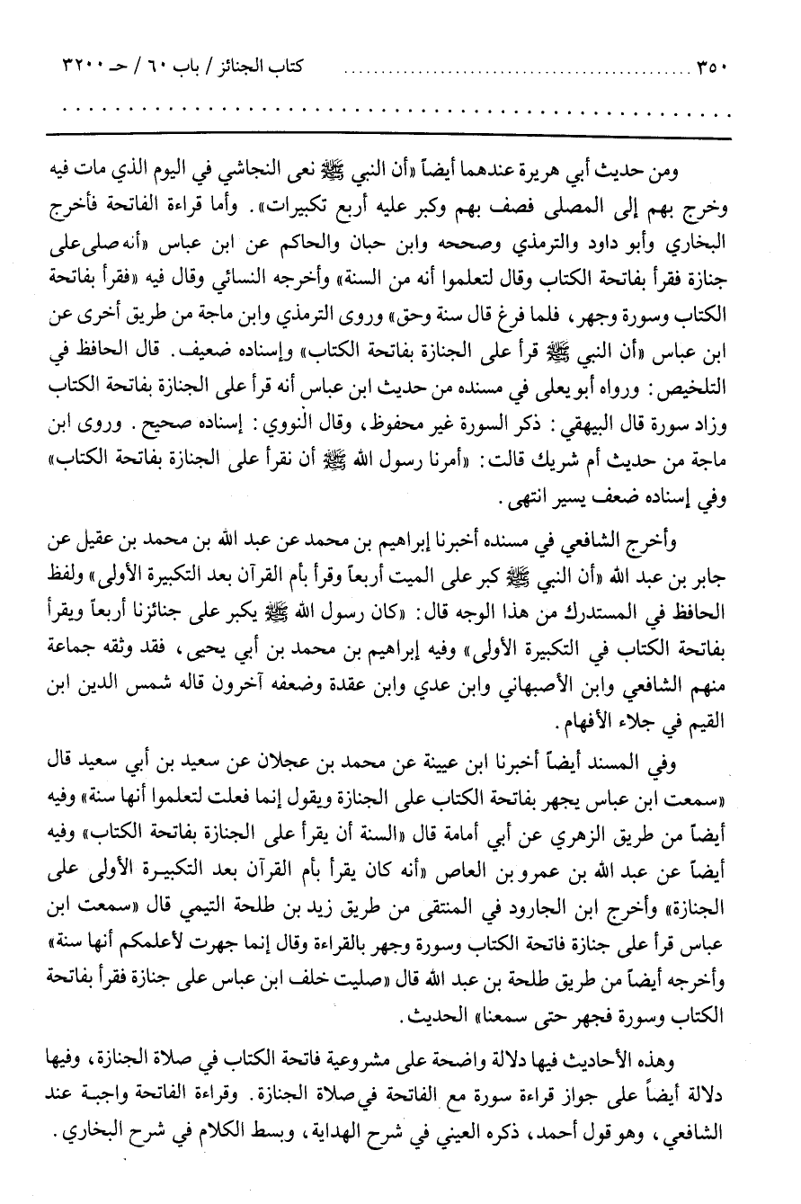 وَأَمَّا قِرَاءَةُ الْفَاتِحَةِ فَأَخْرَجَ البخاري وأبو داود والترمذي وصححه وبن حبان والحاكم عن بن عَبَّاسٍ أَنَّهُ صَلَّى عَلَى جِنَازَةٍ فَقَرَأَ بِفَاتِحَةِ الْكِتَابِ وَقَالَ لِتَعْلَمُوا أَنَّهُ مِنَ السُّنَّةِ وَأَخْرَجَهُ النَّسَائِيُّ وَقَالَ فِيهِ فَقَرَأَ بِفَاتِحَةِ الْكِتَابِ وَسُورَةٍ وَجَهَرَ فَلَمَّا فَرَغَ قَالَ سُنَّةٌ وَحَقٌّ وَرَوَى الترمذي وبن ماجه من طريق أخرى عن بن عباس أن النبي قَرَأَ عَلَى الْجِنَازَةِ بِفَاتِحَةِ الْكِتَابِ وَإِسْنَادُهُ ضَعِيفٌ