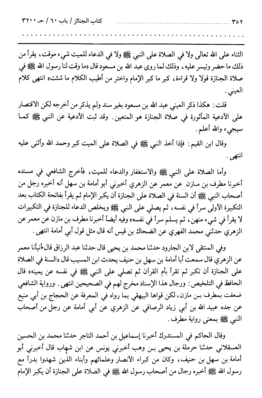 وَقَالَ الْحَاكِمُ فِي الْمُسْتَدْرَكِ أَخْبَرَنَا إِسْمَاعِيلُ بْنُ أَحْمَدَ التَّاجِرُ حَدَّثَنَا مُحَمَّدُ بْنُ الْحُسَيْنِ الْعَسْقَلَانِيُّ حَدَّثَنَا حَرْمَلَةُ بْنُ يَحْيَى حدثنا بن وهب أخبرني يونس عن بن شِهَابٍ قَالَ أَخْبَرَنِي أَبُو أُمَامَةَ بْنُ سَهْلِ بْنِ حُنَيْفٍ وَكَانَ مِنْ كُبَرَاءِ الْأَنْصَارِ وَعُلَمَائِهِمْ وَأَبْنَاءِ الَّذِينَ شَهِدُوا بَدْرًا مَعَ رَسُولِ اللَّهِ أخبره رجال من أصحاب رسول الله فِي الصَّلَاةِ عَلَى الْجِنَازَةِ أَنْ يُكَبِّرَ الْإِمَامُ