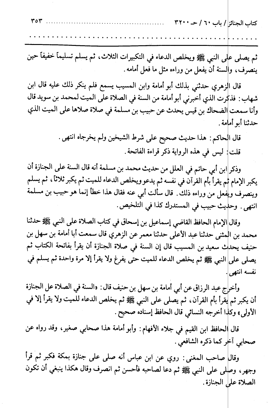 وَقَالَ الْإِمَامُ الْحَافِظُ الْقَاضِي إِسْمَاعِيلُ بْنُ إِسْحَاقَ فِي كِتَابِ الصَّلَاةِ عَلَى النَّبِيِّ حَدَّثَنَا مُحَمَّدُ بْنُ الْمُثَنَّى حَدَّثَنَا عَبْدُ الْأَعْلَى حَدَّثَنَا مَعْمَرٌ عَنِ الزُّهْرِيِّ قَالَ سَمِعْتُ أَبَا أُمَامَةَ بْنَ سَهْلِ بْنِ حُنَيْفٍ يُحَدِّثُ سَعِيدَ بْنَ الْمُسَيِّبِ قَالَ إِنَّ السُّنَّةَ فِي صَلَاةِ الْجِنَازَةِ أَنْ يَقْرَأَ بِفَاتِحَةِ الْكِتَابِ ثُمَّ يُصَلِّيَ على النبي ثُمَّ يُخْلِصَ الدُّعَاءَ لِلْمَيِّتِ حَتَّى يَفْرُغَ وَلَا يَقْرَأُ إِلَّا مَرَّةً وَاحِدَةً ثُمَّ يُسَلِّمُ فِي نَفْسِهِ انْتَهَى