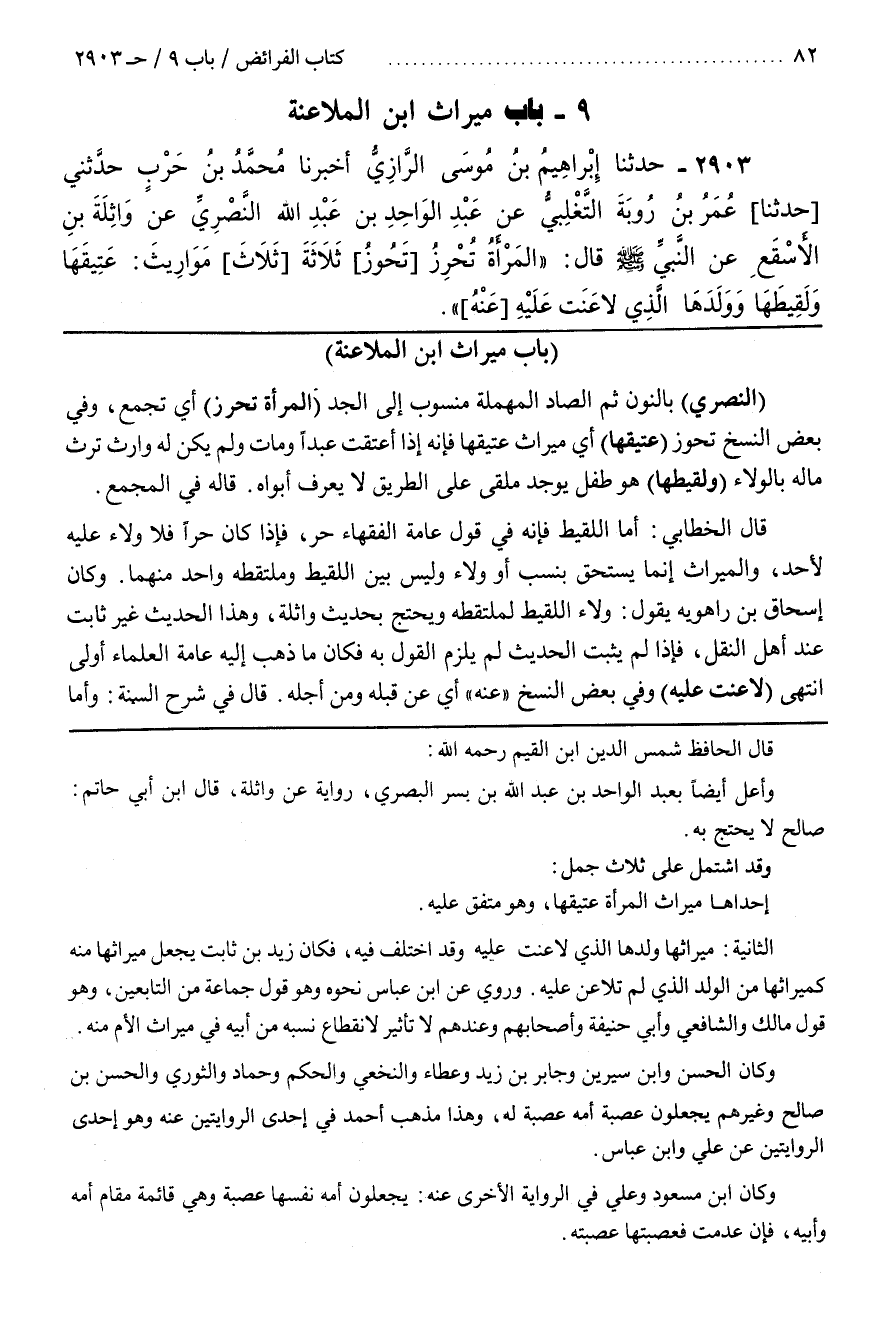 [2906] (النَّصْرِيُّ) بِالنُّونِ ثُمَّ الصَّادِ الْمُهْمَلَةِ مَنْسُوبٌ إِلَى الْجَدِّ (الْمَرْأَةُ تُحْرِزُ) أَيْ تَجْمَعُ وَفِي بَعْضِ النُّسَخِ تَحُوزُ (عَتِيقَهَا) أَيْ مِيرَاثُ عَتِيقِهَا فَإِنَّهُ إِذَا أَعْتَقَتْ عَبْدًا وَمَاتَ لَمْ يَكُنْ لَهُ وَارِثٌ تَرِثُ مَالَهُ بِالْوَلَاءِ (وَلَقِيطُهَا) هُوَ طِفْلٌ يُوجَدُ مُلْقًى عَلَى الطَّرِيقِ لَا يُعْرَفُ أَبَوَاهُ