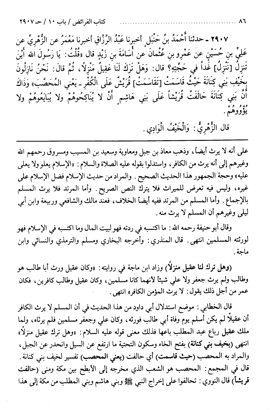 [2910] (وَهَلْ تَرَكَ لَنَا عَقِيلٌ مَنْزِلًا) وَزَادَ بن مَاجَهْ فِي رِوَايَتِهِ وَكَانَ عَقِيلٌ وَرِثَ أَبَا طَالِبٍ هُوَ وَطَالِبٌ وَلَمْ يَرِثْ جَعْفَرٌ وَلَا عَلِيٌّ شَيْئًا لِأَنَّهُمَا كَانَا مُسْلِمَيْنِ وَكَانَ عَقِيلٌ وَطَالِبٌ كَافِرَيْنِ فَكَانَ عُمَرُ مِنْ أَجْلِ ذَلِكَ يَقُولُ لَا يَرِثُ الْمُؤْمِنُ الْكَافِرَ انْتَهَى
