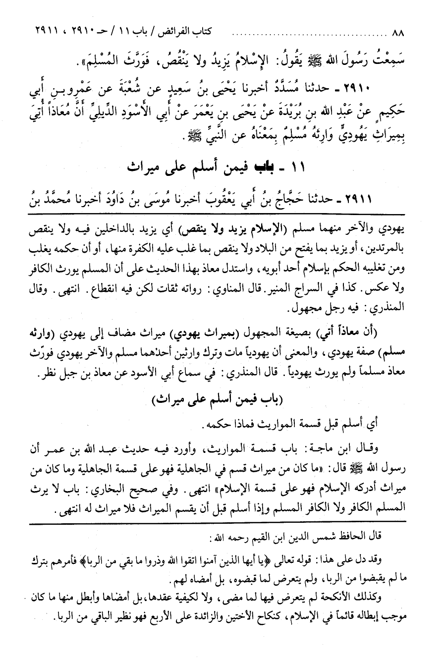 وقال بن مَاجَهْ بَابُ قِسْمَةِ الْمَوَارِيثِ وَأَوْرَدَ فِيهِ حَدِيثِ عَبْدِ اللَّهِ بْنِ عُمَرُ أَنَّ رَسُولَ اللَّهِ صَلَّى اللَّهُ عَلَيْهِ وَسَلَّمَ قَالَ مَا كَانَ مِنْ مِيرَاثٍ قُسِمَ فِي الْجَاهِلِيَّةِ فَهُوَ عَلَى قِسْمَةِ الْجَاهِلِيَّةِ وَمَا كَانَ مِنْ مِيرَاثٍ أَدْرَكَهُ الْإِسْلَامُ فَهُوَ عَلَى قِسْمَةِ الْإِسْلَامِ انْتَهَى