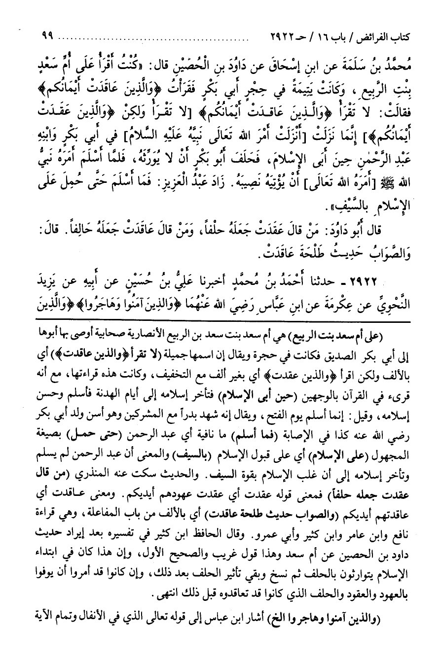 [2923] (عَلَى أُمِّ سَعْدِ بِنْتِ الرَّبِيعِ) هِيَ أُمُّ سَعْدٍ بِنْتِ سَعْدِ بْنِ الرَّبِيعِ الْأَنْصَارِيَّةِ صَحَابِيَّةٌ أَوْصَى بِهَا أَبُوهَا إِلَى أَبِي بَكْرٍ الصِّدِّيقِ فَكَانَتْ فِي حِجْرِهِ وَيُقَالُ إِنَّ اسْمَهَا جَمِيلَةٌ (لَا تَقْرَأُ وَالَّذِينَ عَاقَدَتْ) أَيْ بِالْأَلِفِ وَلَكِنِ اقرأ والذين عقدت أَيْ بِغَيْرِ أَلِفٍ مَعَ التَّخْفِيفِ وَكَانَتْ هَذِهِ قِرَاءَتَهَا مَعَ أَنَّهُ قُرِئَ فِي الْقُرْآنِ بِالْوَجْهَيْنِ (حِينَ أَبَى الْإِسْلَامَ) فَتَأَخَّرَ إِسْلَامُهُ إِلَى أَيَّامِ الْهُدْنَةِ فَأَسْلَمَ وَحَسُنَ إِسْلَامُهُ وَقِيلَ إِنَّمَا أَسْلَمَ يَوْمَ الْفَتْحِ وَيُقَالُ إِنَّهُ شَهِدَ بَدْرًا مَعَ الْمُشْرِكِينَ وَهُوَ أَسَنُّ وَلَدِ أَبِي بَكْرٍ رَضِيَ اللَّهُ عَنْهُ كَذَا فِي الْإِصَابَةِ (فَمَا أَسْلَمَ) مَا نَافِيَةٌ أَيْ عَبْدُ الرَّحْمَنِ (حَتَّى حُمِلَ) بِصِيغَةِ الْمَجْهُولِ (عَلَى الْإِسْلَامِ) أَيْ عَلَى قَبُولِ الْإِسْلَامِ (بِالسَّيْفِ) وَالْمَعْنَى أَنَّ عَبْدَ الرَّحْمَنِ لَمْ يُسْلِمْ وَتَأَخَّرَ إِسْلَامُهُ إِلَى أَنْ غَلَبَ الْإِسْلَامُ بِقُوَّةِ السَّيْفِ