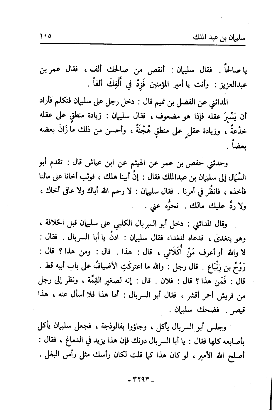 قال: فمن هذا؟ قال: فلان. قال: إنه لصغير القمة، ونظر إلى رجل من قريش أحمر أقشر، فقال أبو السربال: أما هذا فلا أسال عنه، هذا قيصر. فضحك سليمان.