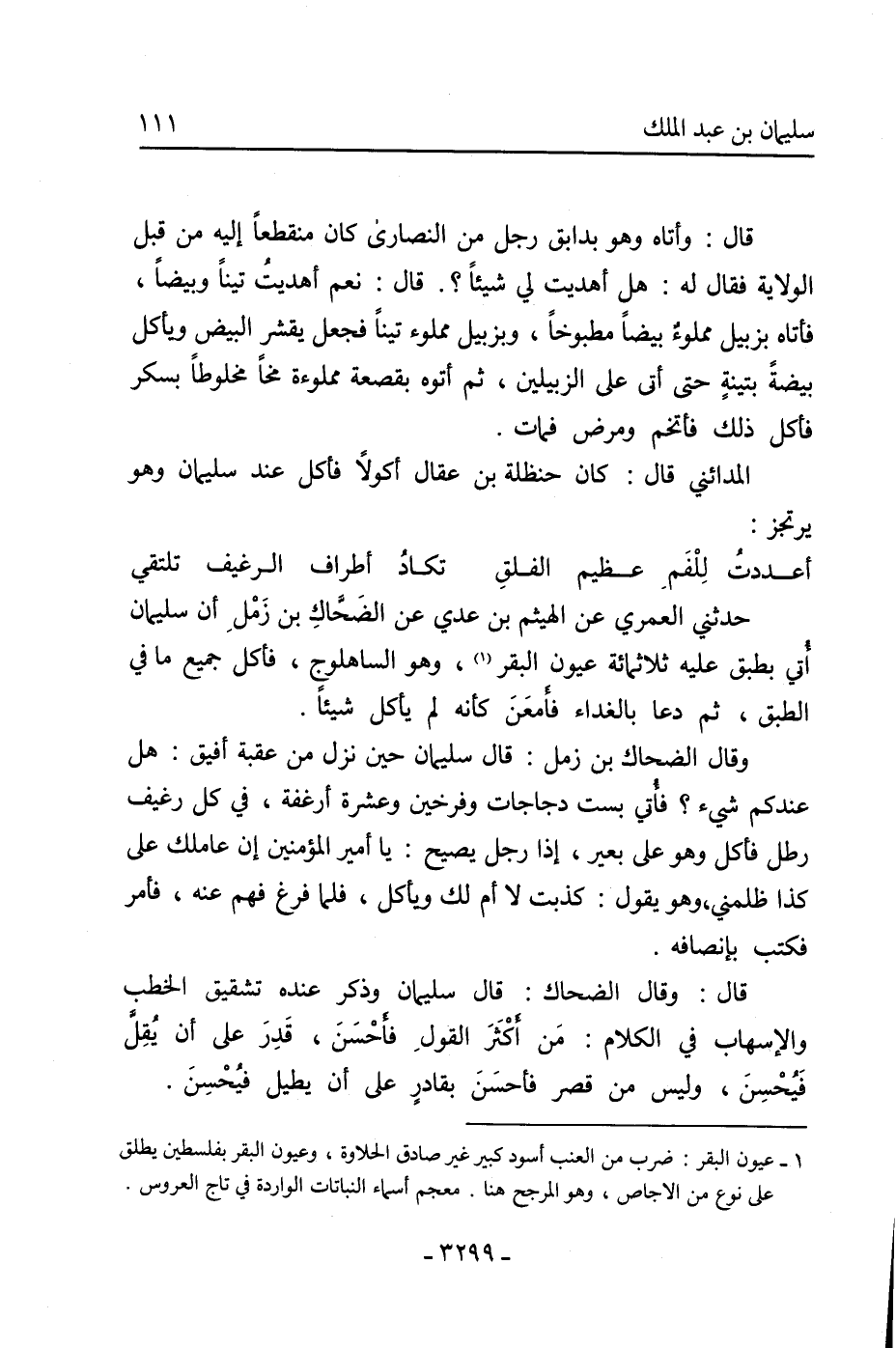حَدَّثَنِي العمري عَن الهيثم بن عدي عَنِ الضحاك بن زمل أن سليمان أتي بطبق عليه ثلاثمائة عيون البقر [1] ، وهو الساهلوج، فأكل جميع ما في الطبق، ثم دعا بالغداء فأمعن كأنه لم يأكل شيئا.