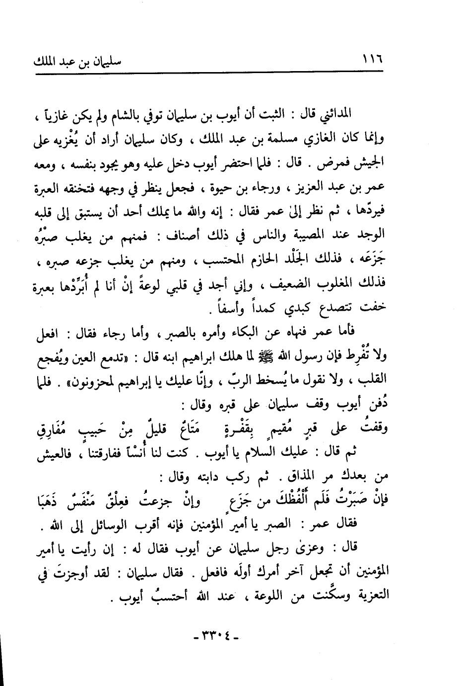 قال: وعزى رجل سليمان عن أيوب فقال له: إن رأيت يا أمير المؤمنين أن تجعل آخر أمرك أوله فافعل. فقال سليمان: لقد أوجزت في التعزية وسكنت من اللوعة، عند الله أحتسب أيوب.