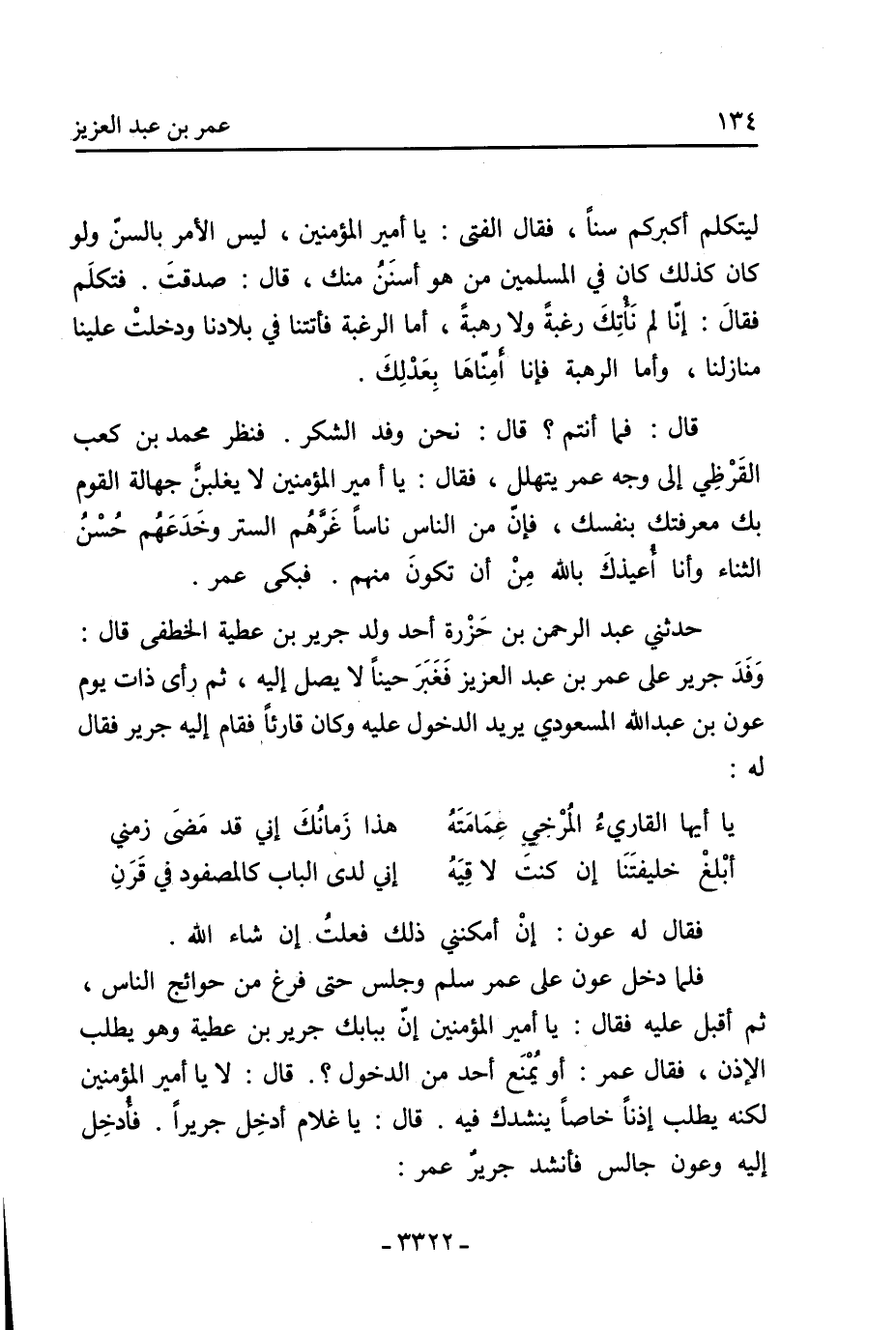 فلما دخل عون على عمر سلم وجلس حتى فرغ من حوائج الناس، ثم أقبل عليه فقال: يا أمير المؤمنين إن ببابك جرير بن عطية وهو يطلب الإذن، فقال عمر: أو يمنع أحد من الدخول؟. قال: لا يا أمير المؤمنين لكنه يطلب إذنا خاصا ينشدك فيه. قال: يا غلام أدخل جريرا. فأدخل إليه وعون جالس فأنشد جرير عمر: