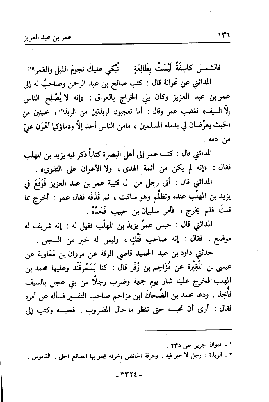 المدائني عن عوانة قال: كتب صالح بن عبد الرحمن وصاحب له إلى عمر بن عبد العزيز وكان يلي الخراج بالعراق: «إنه لا يصلح الناس إلا السيف» فغضب عمر وقال: أما تعجبون لربذتين من الربذ [2] ، خبيثين من الخبث يعرضان لي بدماء المسلمين، ما من الناس أحد إلا ودماؤكما أهون علي من دمه.