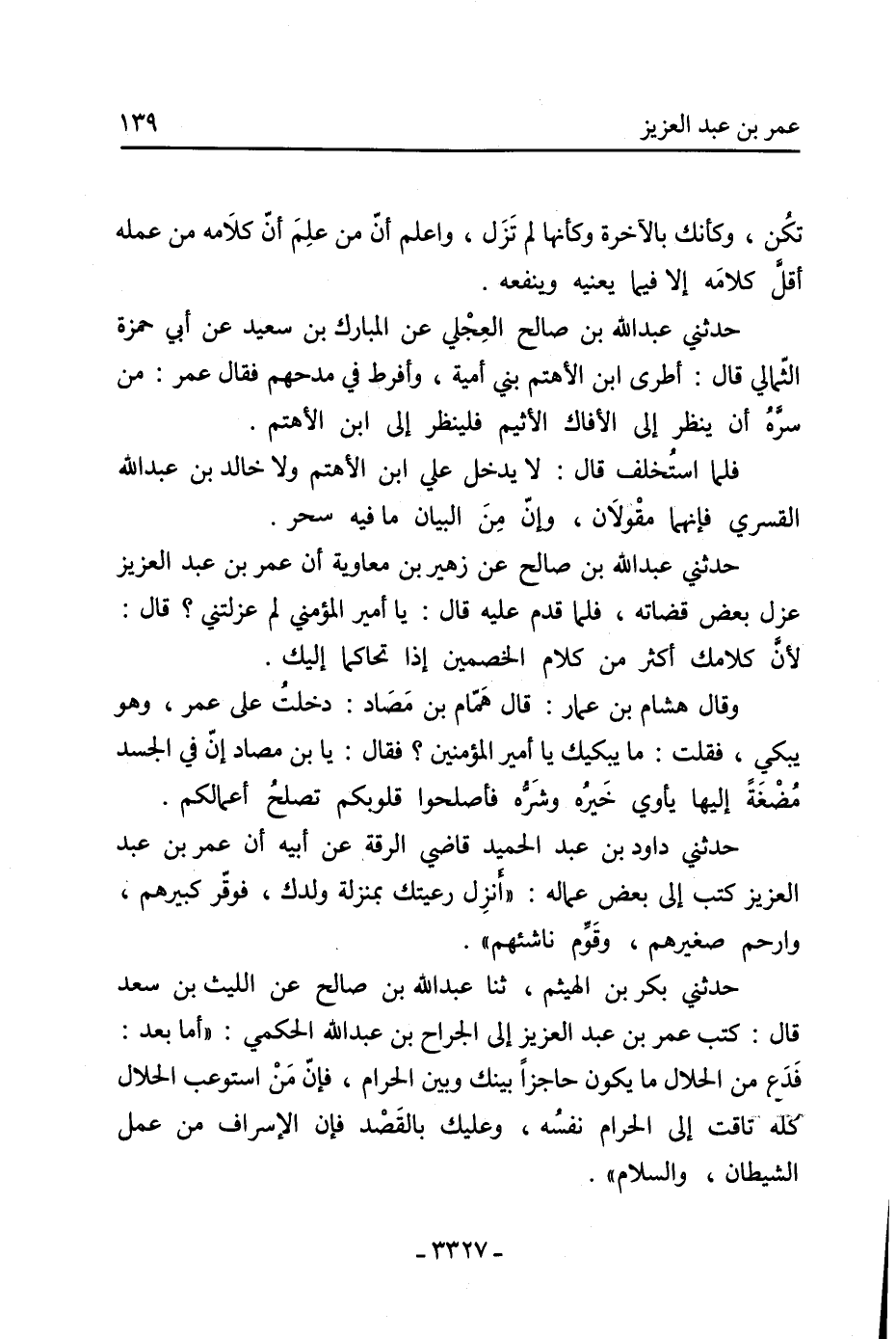حَدَّثَنِي بَكْرُ بْنُ الْهَيْثَمِ، ثنا عَبْدُ اللَّهِ بْن صَالِح عَن الليث بْن سعد قَالَ: كتب عُمَر بْن عَبْد الْعَزِيزِ إِلَى الجراح بن عبد الله الحكمي: «أما بعد: