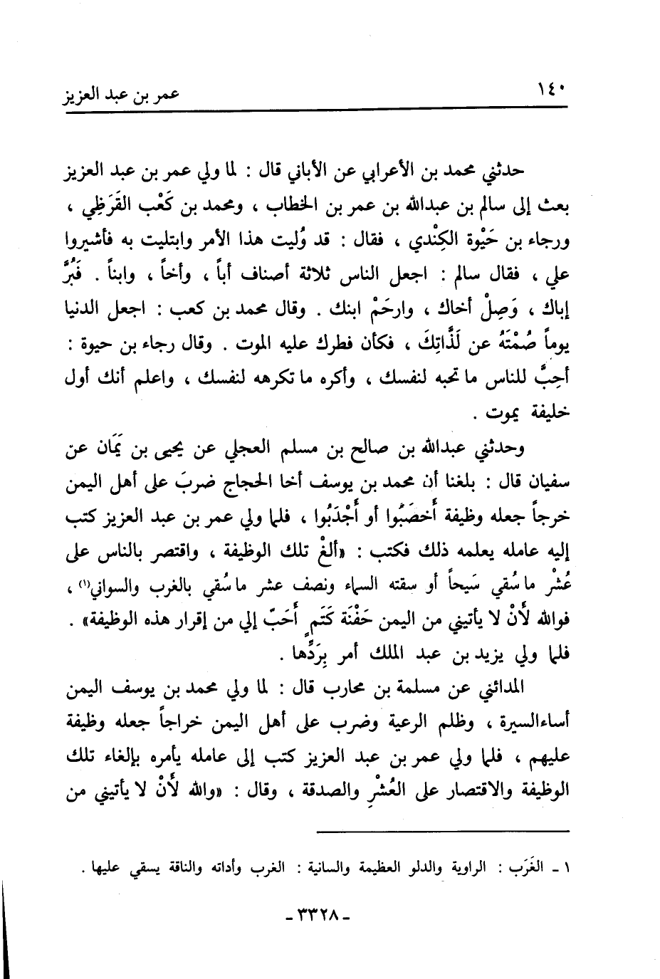 وَحَدَّثَنِي عَبْدُ اللَّهِ بْنُ صَالِحِ بْنِ مُسْلِمٍ الْعِجْلِيُّ عَنْ يحيى بْن يمان عَنْ سُفْيَان قَالَ: بلغنا أن محمد بن يوسف أخا الحجاج ضرب على أهل اليمن خرجا جعله وظيفة أخصبوا أو أجدبوا، فلما ولى عُمَر بْن عَبْد الْعَزِيزِ كتب إليه عامله يعلمه ذلك فكتب: «ألغ تلك الوظيفة، واقتصر بالناس على عشر ما سقي سيحا أو سقته السماء ونصف عشر ما سقي بالغرب والسواني [1] ، فو الله لأن لا يأتيني من اليمن حفنة كتم أحب إِلَى منَ إقرار هَذِهِ الوظيفة» .