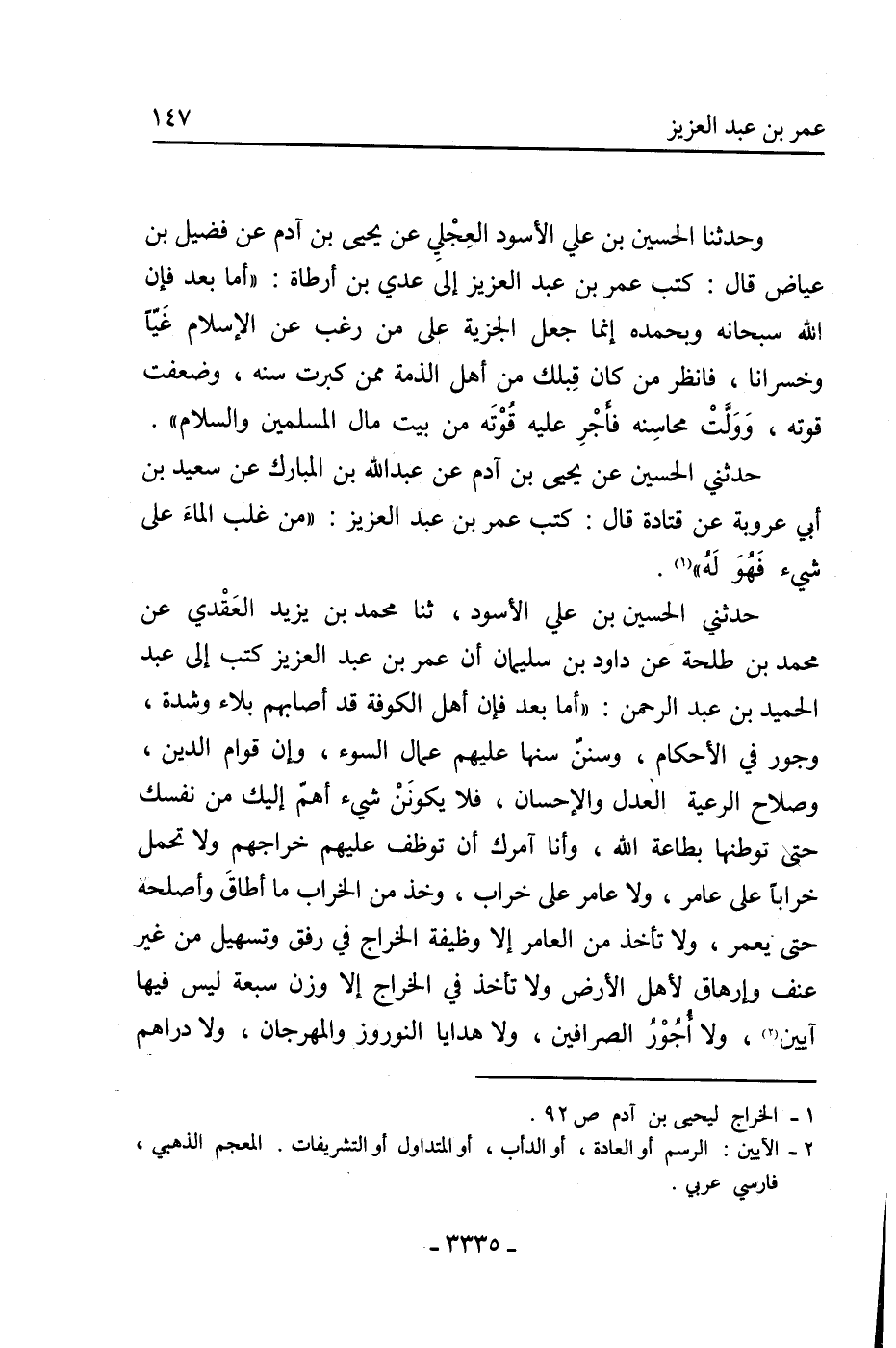 حدثني الحسين بن علي الأسود، ثنا محمد بن يزيد العقدي عن محمد بن طلحة عن داود بن سليمان أن عمر بن عبد العزيز كتب إلى عبد الحميد بن عبد الرحمن: «أما بعد فإن أهل الكوفة قد أصابهم بلاء وشدة، وجور في الأحكام، وسنن سنها عليهم عمال السوء، وإن قوام الدين، وصلاح الرعية العدل والإحسان، فلا يكونن شيء أهم إليك من نفسك حتى توطنها بطاعة الله، وأنا آمرك أن توظف عليهم خراجهم ولا تحمل خرابا على عامر، ولا عامر على خراب، وخذ من الخراب ما أطاق وأصلحه حتى يعمر، ولا تأخذ من العامر إلا وظيفة الخراج في رفق وتسهيل من غير عنف وإرهاق لأهل الأرض ولا تأخذ في الخراج إلا وزن سبعة ليس فيها آيين [2] ، ولا أجور الصرافين، ولا هدايا النوروز والمهرجان، ولا دراهم