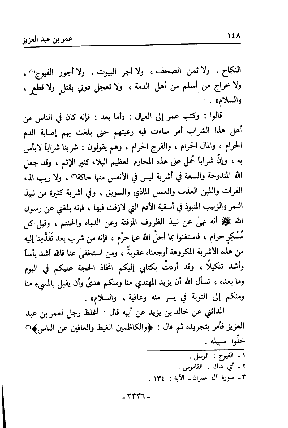 النكاح، ولا ثمن الصحف، ولا أجر البيوت، ولا أجور الفيوج [1] ، ولا خراج من أسلم من أهل الذمة، ولا تعجل دوني بقتل ولا قطع، والسلام» .